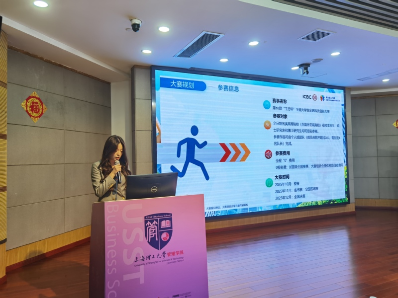 9月22日下午,第15届“工行杯”全国大学生金融科技创新大赛(上海理工大学)颁奖典礼暨第16届大赛启动宣讲活动在管理学院四楼第二会议室报告厅举行。中国工商银行杨浦支行党委委员、副行长顾贝伶,工行上海市分行金融科技部高级经理梅竹影、金融科技部科长张华、管理学院副院长房志明、金融与国际经贸系主任张青龙、副主任张玲、研究生金融科技创新实践基地负责人许学军、管理学院青年教师发展促进会副会长廖昕、以及工行杨浦支行部分员工和管院相关专业的部分研究生和本科生参加了本次活动。