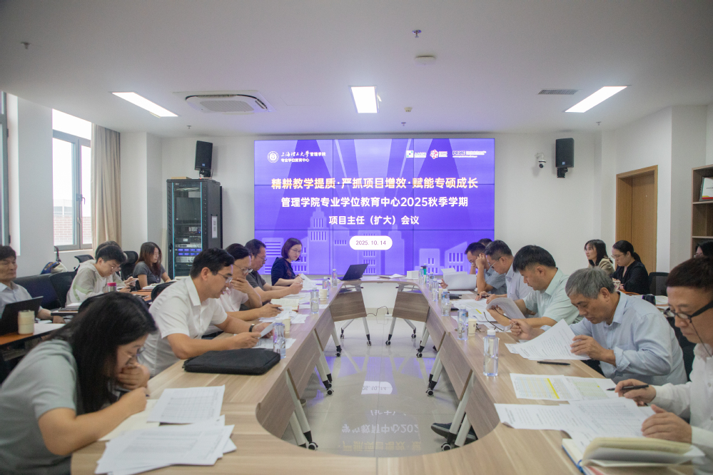 10月14日,管理学院专业学位教育中心召开以“精耕教学提质·严抓项目增效·赋能专硕成长”为主题的2025秋季学期项目主任(扩大)会议。管理学院院长、专业学位教育中心主任赵来军,学院党委书记马静波,MBA项目主任张峥,MEM项目主任叶春明,MPAcc项目副主任于谦龙,MF项目主任高广阔,MIB项目主任秦炳涛,MT项目主任田发,中心综合办公室主任孟陈莉以及中心全体行政人员参加会议。会议由副院长刘魏巍主持。