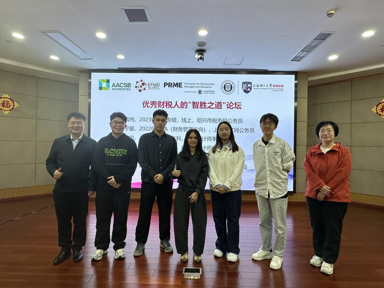 会计与税务系于2025年10月26日在上理管院举办优秀财税人的“智胜之道”论坛暨校友分享活动。本次论坛由管理学院专业学位教育中心综合办公室主任孟陈莉和校友联络员袁军伟提供资源支持,会计与税务系主任、MPAcc项目副主任于谦龙与会计与税务系党支部书记张英婕老师、系副主任赵艾凤组织落实,财税专业本科生、硕士研究生共计70余人通过线上线下结合的方式参与其中。论坛上,分享嘉宾们紧扣财税行业发展趋势,从公务员备考、会计师事务所深耕、学术深造等维度,带来了一场兼具专业性与实用性的知识盛宴。