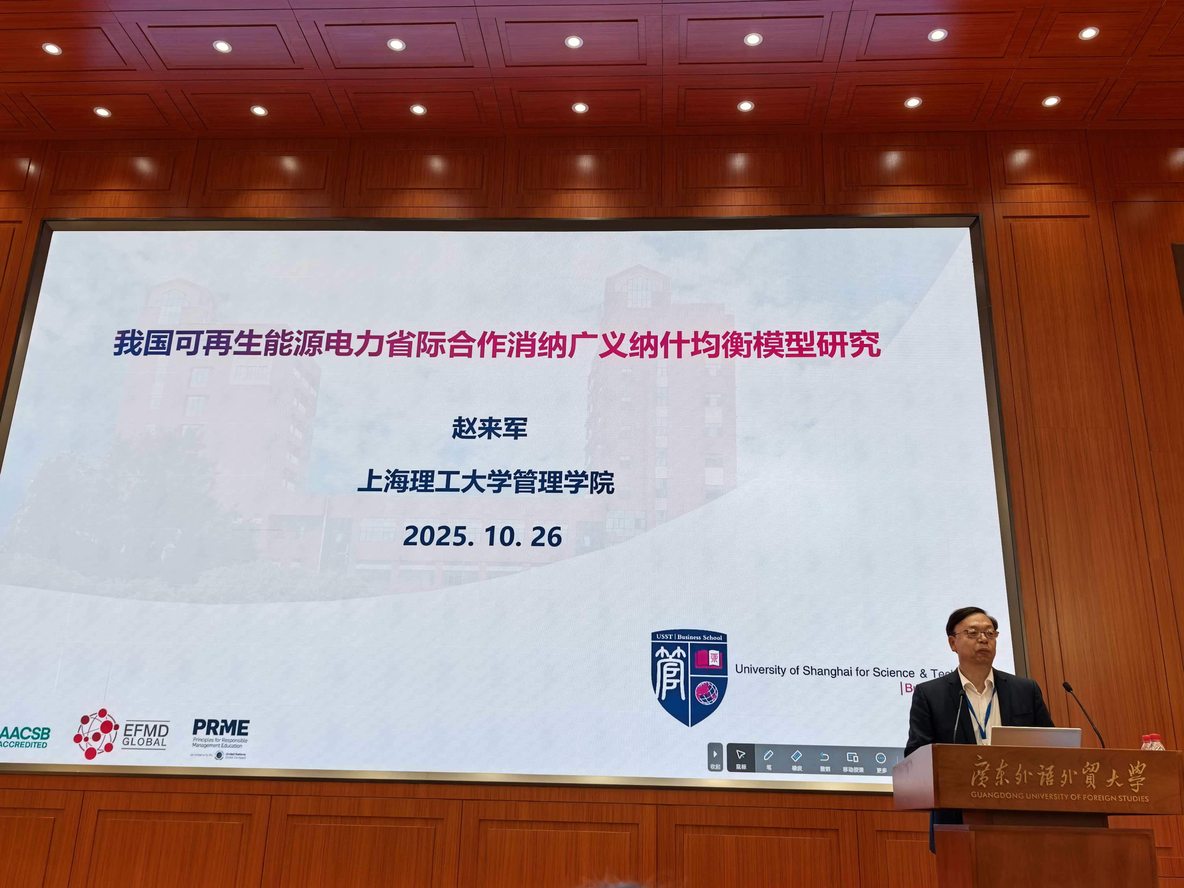 上海理工大学管理学院院长、上海系统科学研究院执行院长赵来军,上海系统科学研究院办公室主任智路平受邀出席本届会议。赵来军作主题报告《我国可再生能源电力省际合作消纳广义纳什均衡模型研究》。报告针对我国可再生能源供需在空间上的逆向分布所导致的独立消纳模式下各省份完成可再生能源电力消纳目标的成本和压力各不相同的困境,设计了省际自发合作消纳机制,该机制包括构建合作消纳模式和设计促进自发合作的激励机制,所提出的可再生能源电力省际合作消纳的广义纳什均衡模型有助于各省份制定经济可行的消纳策略,以有效降低消纳成本,缓解可再生能源资源匮乏省份完成消纳目标的压力。赵来军和智路平共同出席了26日下午的学科发展论坛,并做交流发言。