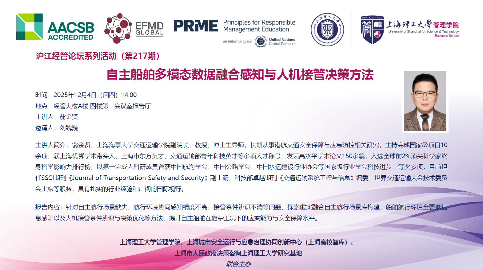 沪江经管论坛系列活动(第217期):自主船舶多模态数据融合感知与人机接管决策方法