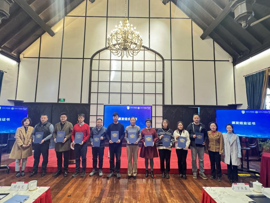 学员代表上海中智科创服务外包有限公司副总经理谢风鹏、卡思优派人力资源集团全国商务开发总监吴浩文分享了学习体会,高度评价课程“既有战略高度,又接地气”,特别是AI赋能招聘效率提升、出海企业合规体系建设等内容对破解“降本增效”行业瓶颈具有直接指导价值。杨浦区人力资源和社会保障局副局长周遐玮,上海理工大学继续教育学院副院长张爱阳、学生处副处长冯磊分别为学员颁发结业证书。