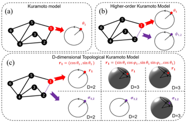 作为支撑复杂网络结构-功能研究的核心理论基础,第一作者为系统科学博士生王降圣、通讯作者为系统科学博导顾长贵教授的研究工作,首次将高阶单纯复形结构与高维 Kuramoto 动力学相结合,提出 D 维拓扑 Kuramoto 模型,系统揭示了网络高阶结构维度对同步相变的主导作用。