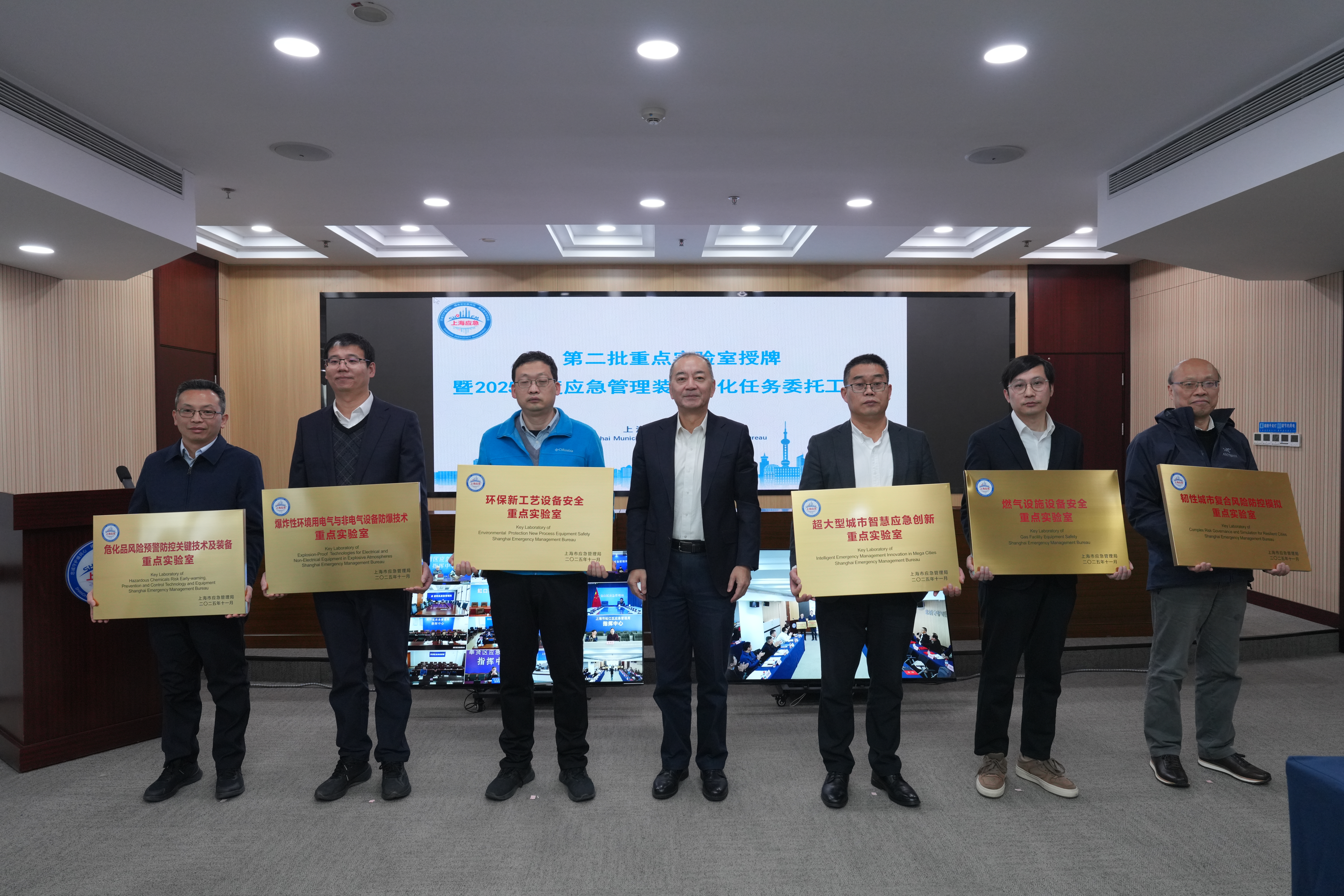 2025年12月26日,上海市应急管理局重点实验室证书颁发仪式在上海市应急管理局举行。上海市应急管理局党委书记、局长马坚泓为各单位颁发证书及铭牌。校党委副书记赵宁代表学校出席仪式并接受“超大型城市智慧应急创新重点实验室”铭牌。
