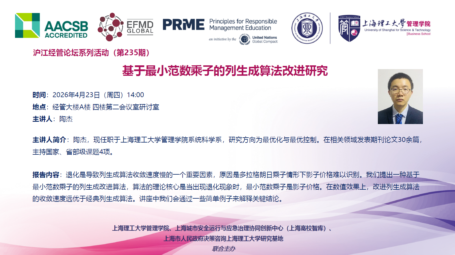 沪江经管论坛系列活动(第235期):基于最小范数乘子的列生成算法改进研究