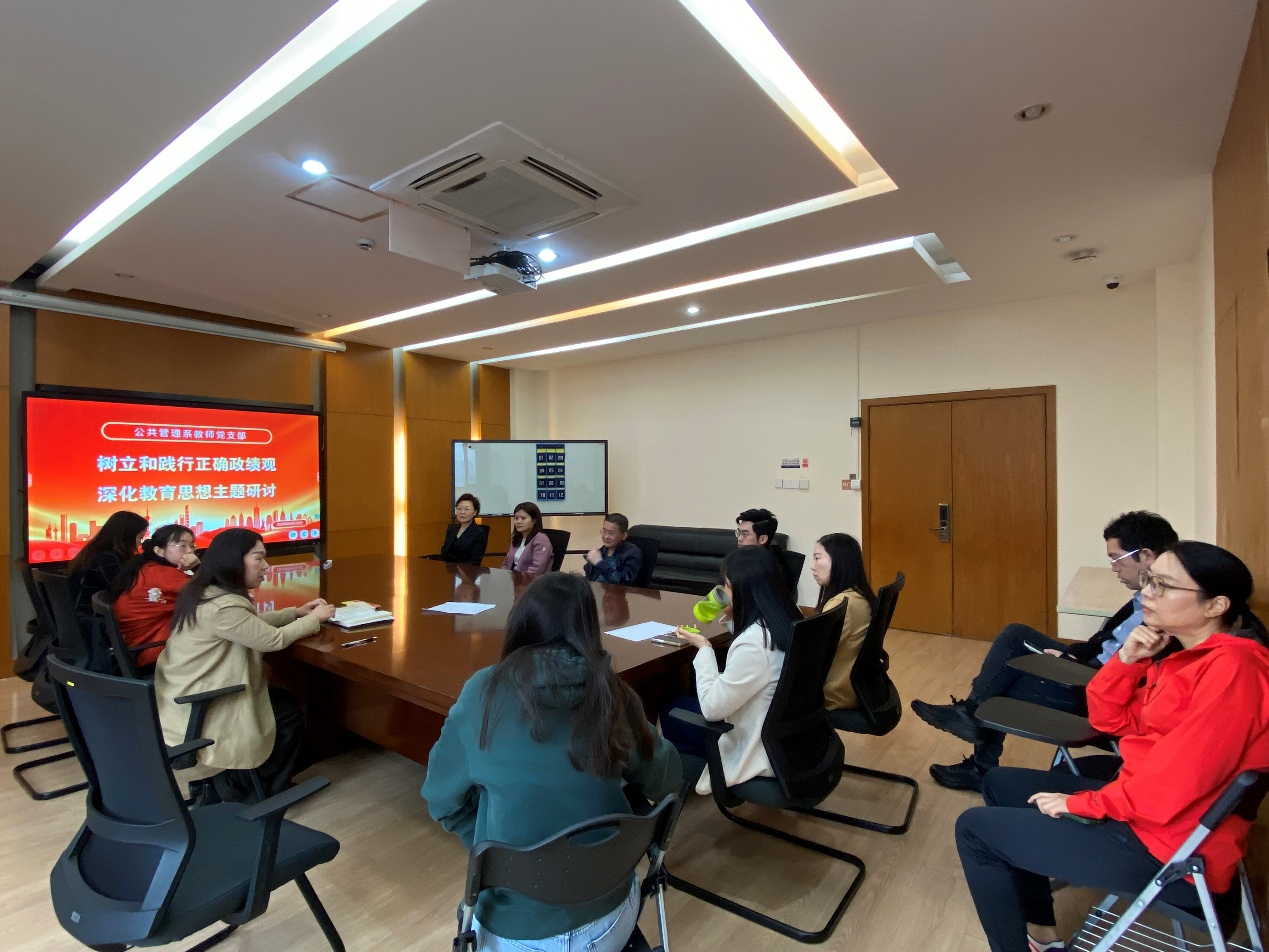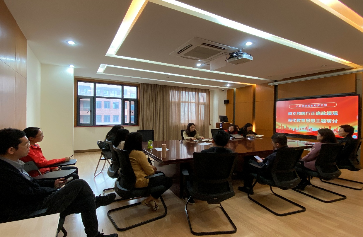 活动第一阶段,党支部开展了树立和践行正确政绩观学习教育,由公共管理系党支部书记闫娟主持。与会党员围绕正确政绩观的基本内涵、实践要求以及高校教师如何立足岗位加以落实进行了学习交流。与会党员表示,正确政绩观强调为民造福、实事求是、注重长远、尊重规律、务求实效。落实到高校基层教学科研单位,就是要坚持立德树人根本任务,不能简单以短期指标和显性成果评价工作成效,而要更加注重人才培养质量、专业建设基础、教师发展成效和学生获得感。