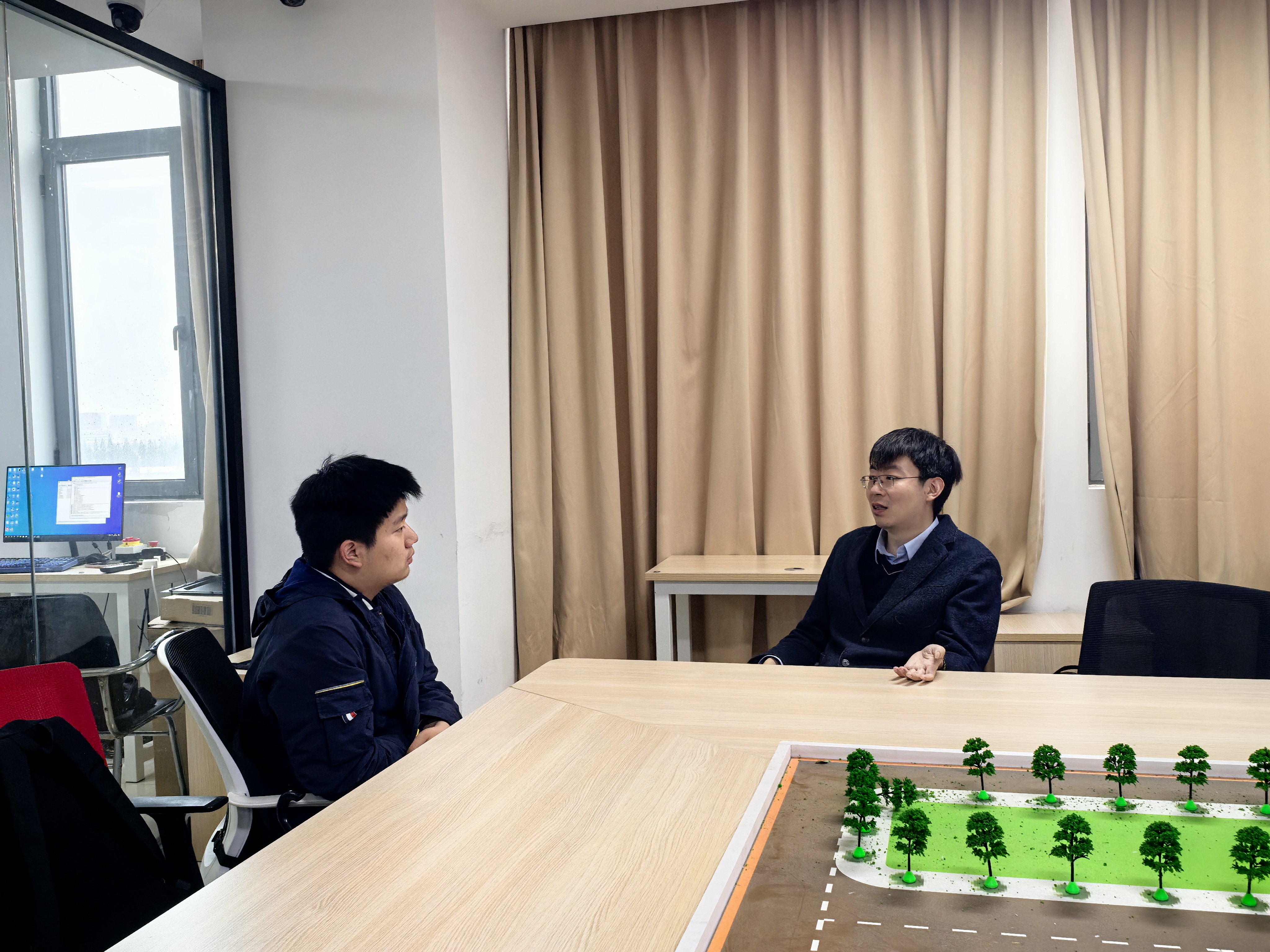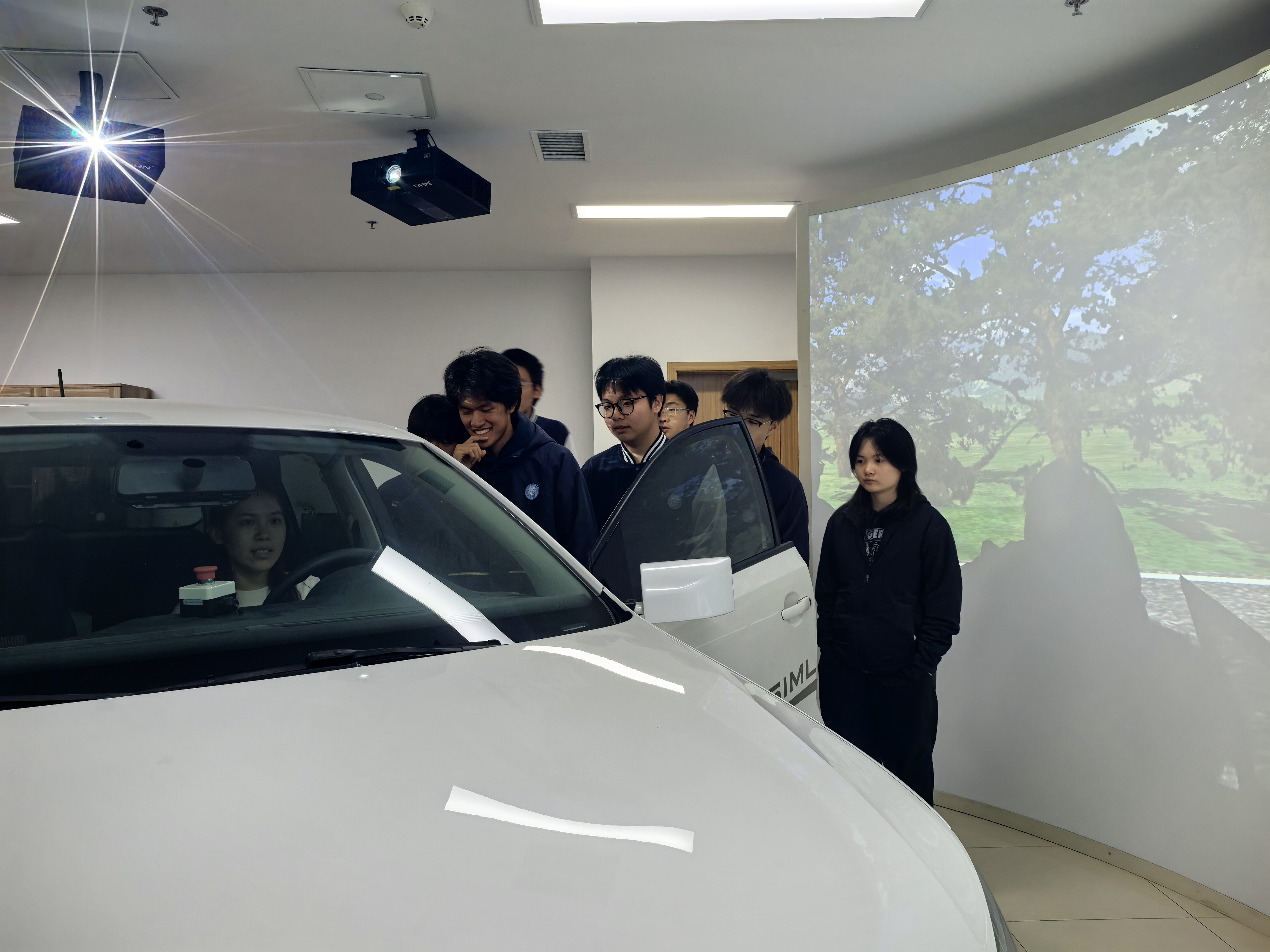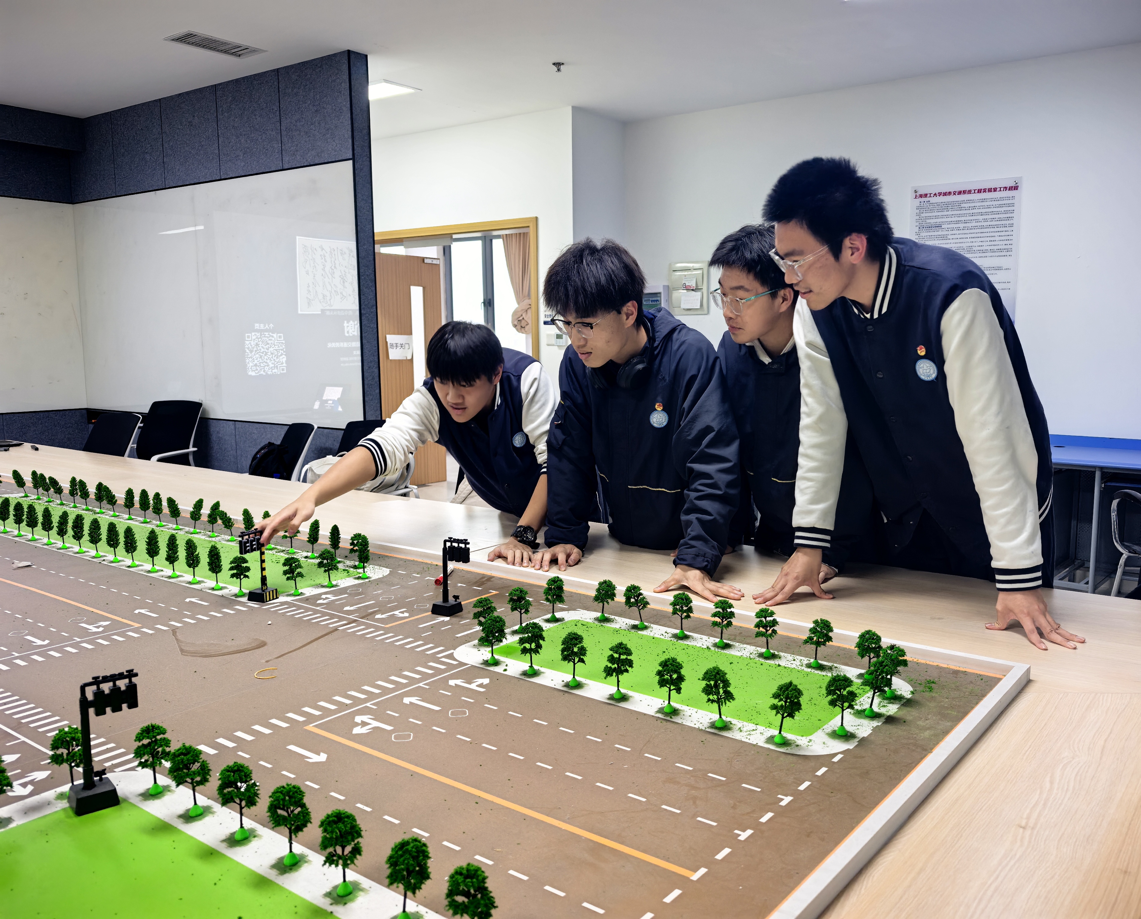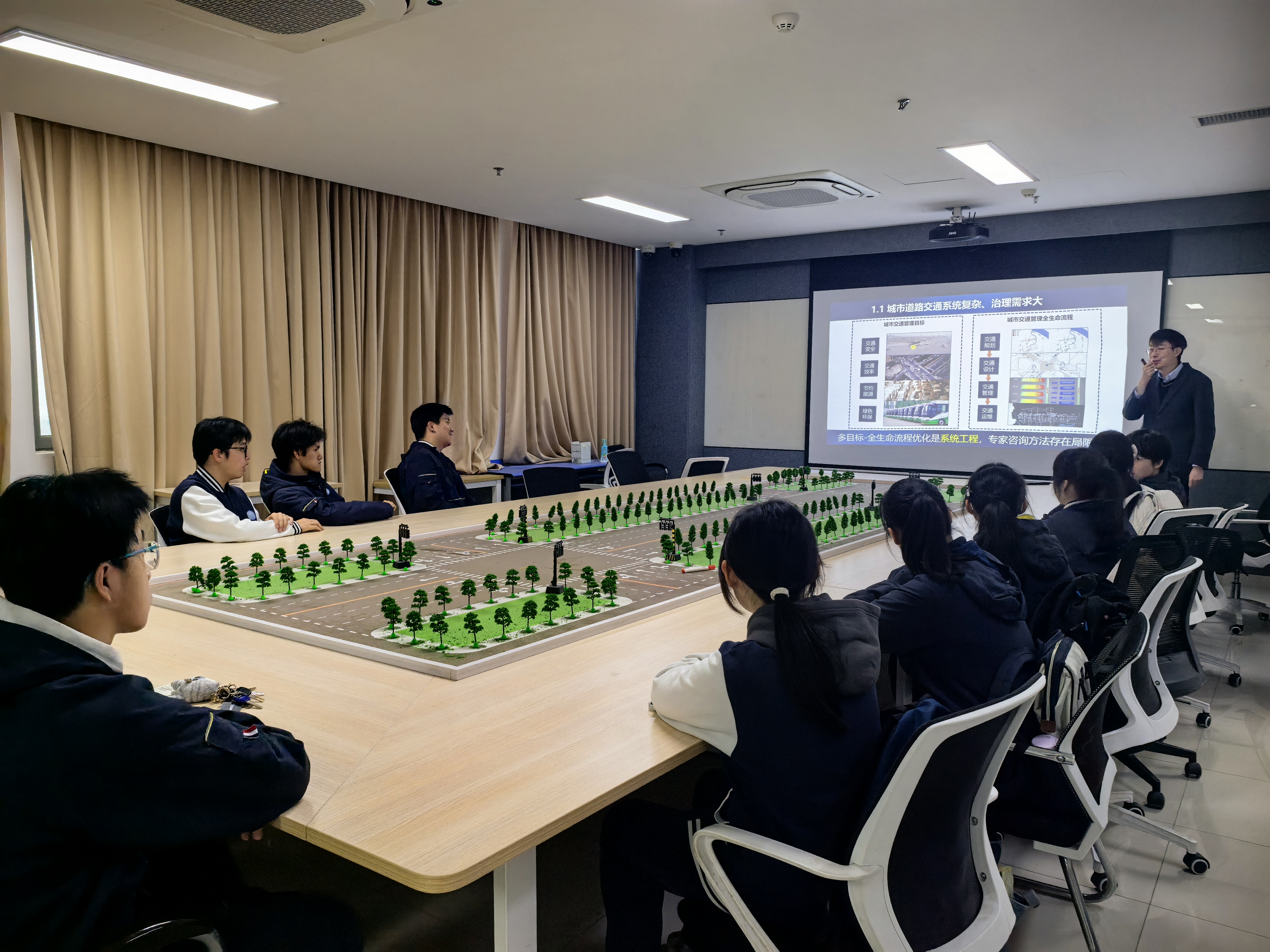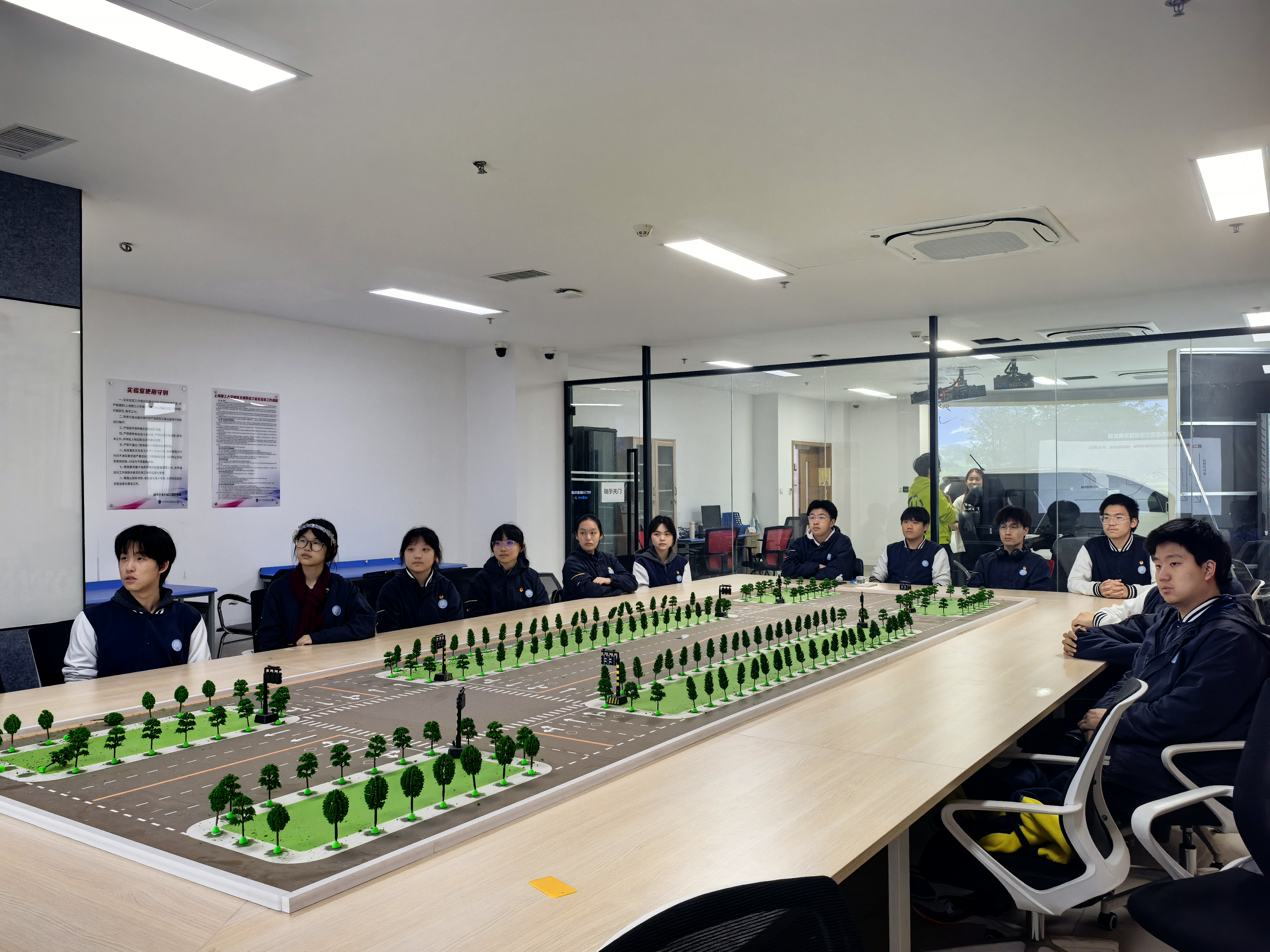 随后,同学们参观了道路交通沙盘实验平台,直观了解交叉口、信号控制、交通流组织等基础交通工程知识。在实践体验环节,同学们走进驾驶模拟实验平台,逐一体验了三自由驾驶模拟系统及双车交互驾驶实验平台,感受车辆驾驶、道路场景感知与交通安全模拟,加深了对智能交通和自动驾驶技术的认识。