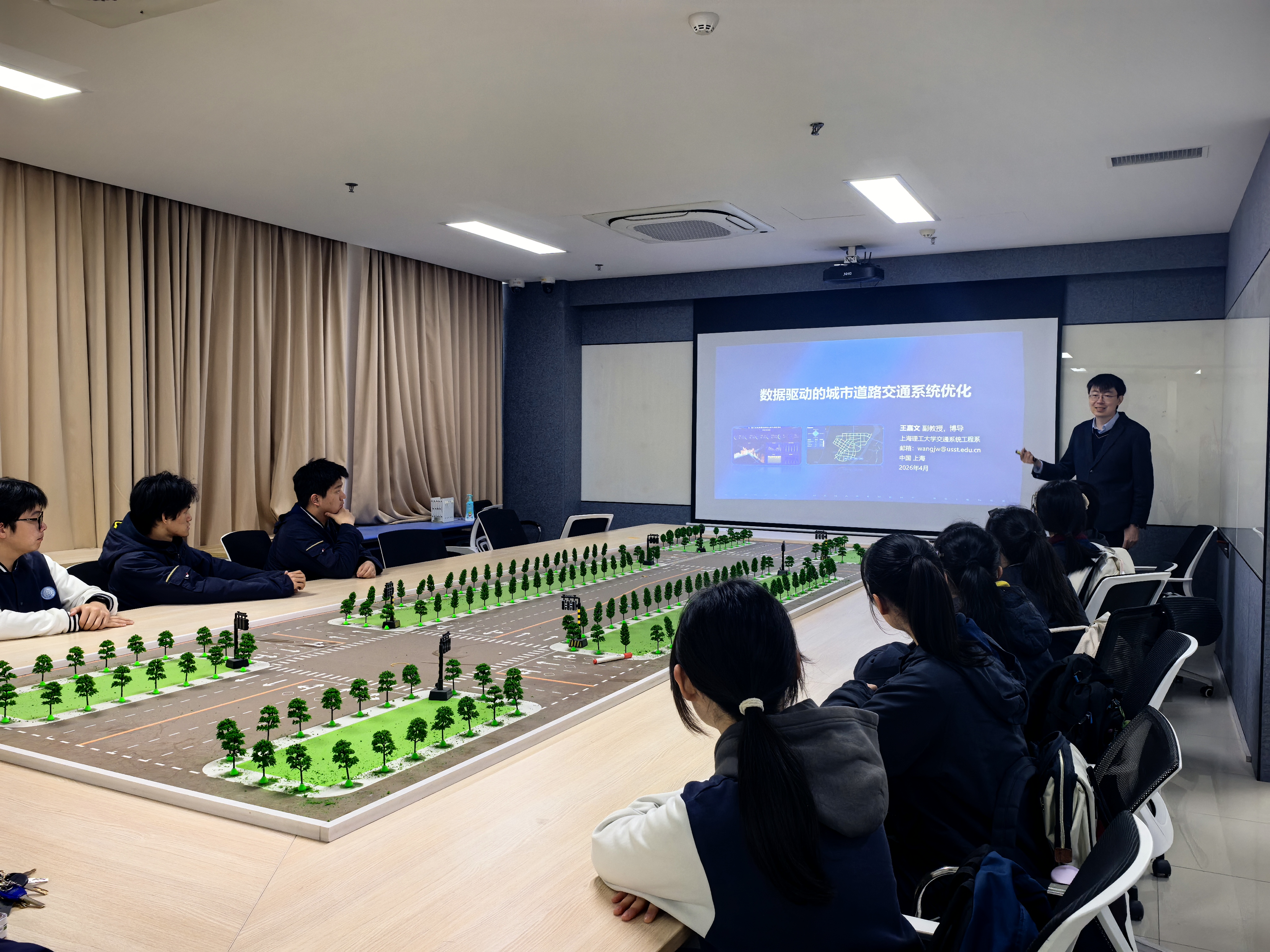 4月29日下午,民星中学高二年级学子走进上海理工大学管理学院交通系统工程实验室参观研学,参加管理学院面向中学生精心组织的智能交通科普实践活动。本次活动由管理学院交通系统工程系副主任、实验室负责人王嘉文主持,通过专题科普讲解、实验平台观摩、科技场景沉浸式体验等形式,带领同学们直观了解城市交通系统运行原理、智能交通治理模式以及自动驾驶技术最新发展成果。
