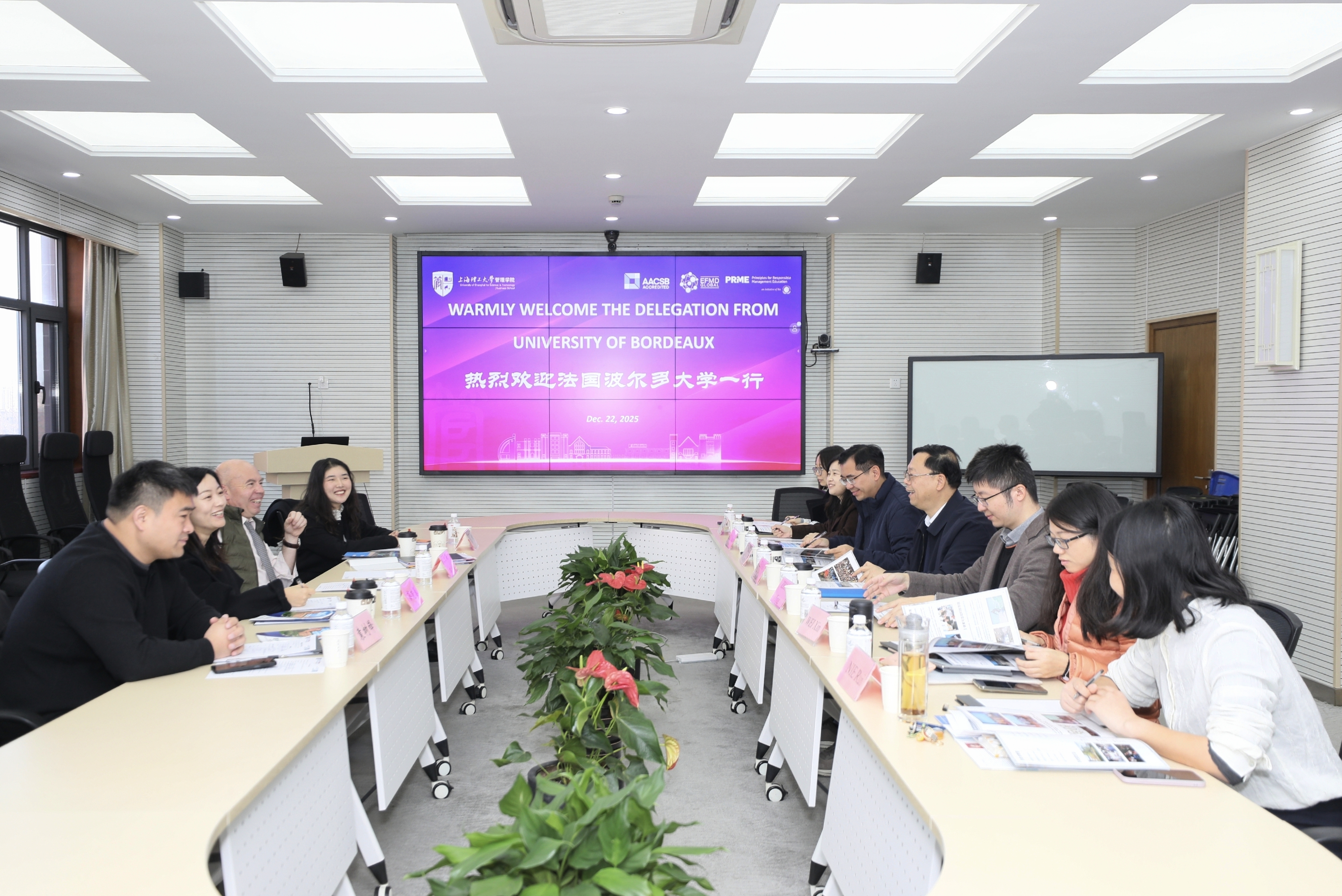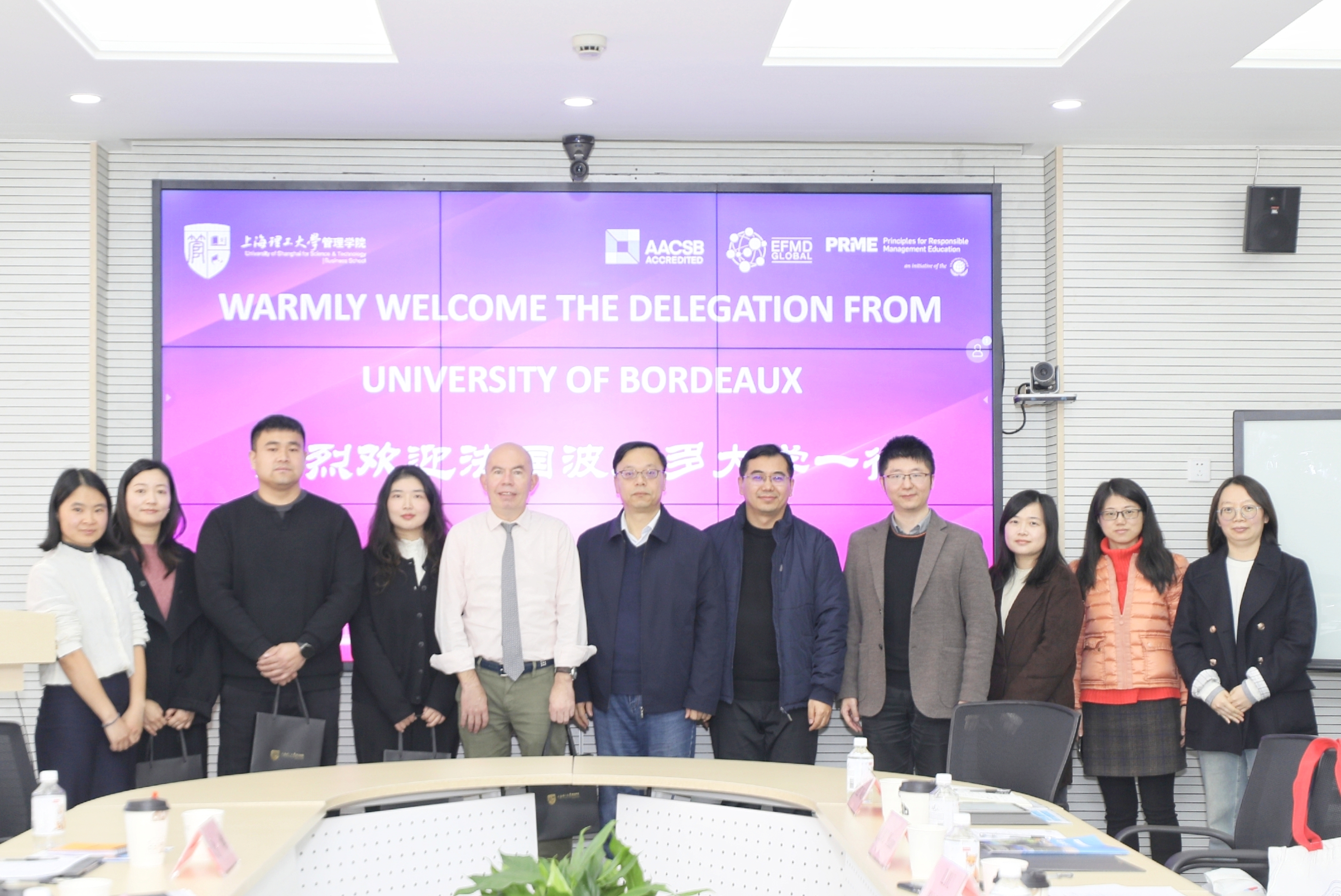 On the morning of December 22, a delegation from the University of Bordeaux, France, visited the Business School(BS). The delegation included Bertrand Blancheton, Dean of the Faculty of Economics, Management, Economic and Social Administration(AES); Zeng Qi, Director of China Affairs and the AASF Sino-French Joint Training Program; Yuan Shufeng, Manager of Sino-French Institutional Cooperation; and Xue Xiaochun, Specialist of Sino-French Institutional Cooperation. The meeting was attended by Zhao Laijun, Dean of the Business School; Zhao Jing and Liu Weiwei, Vice Deans of the BS; Liu Yuan, Manager of the International Cooperation and Exchange Department at the International Affairs Office; and Xie Wei, Director of the Internationalization Office of the BS. The meeting was chaired by Liu Weiwei.