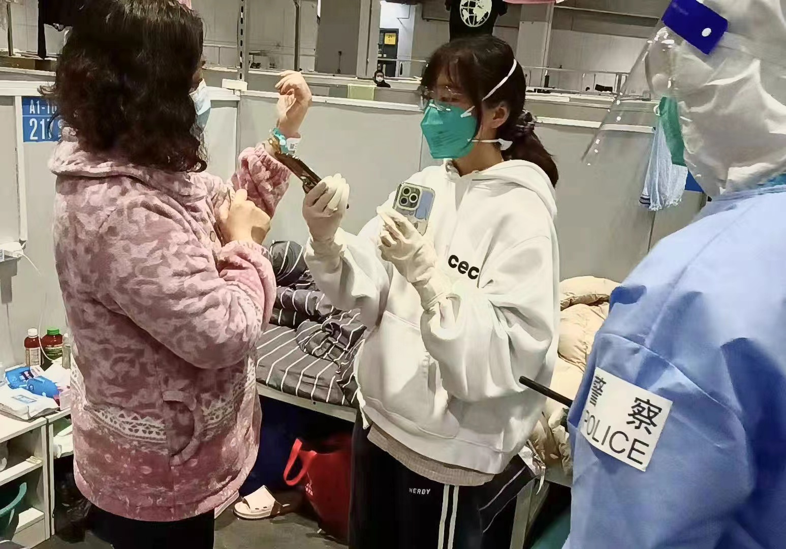 帮助居民配药,进入封控小区做足不出户宣传……。在每天不同的抗疫任务连轴转的情况下,她不幸“中招”了。在3月31日自测出两条杠后,她“虽然有些恐惧,但也能坦然接受,换个角度想整整工作了已近一个月,身体本来就快扛不住了,正好能喘口气休息一下。”然而,当被转运到国家会展中心(四叶草方舱)后,她还是没歇着,再次主动当起了志愿者。