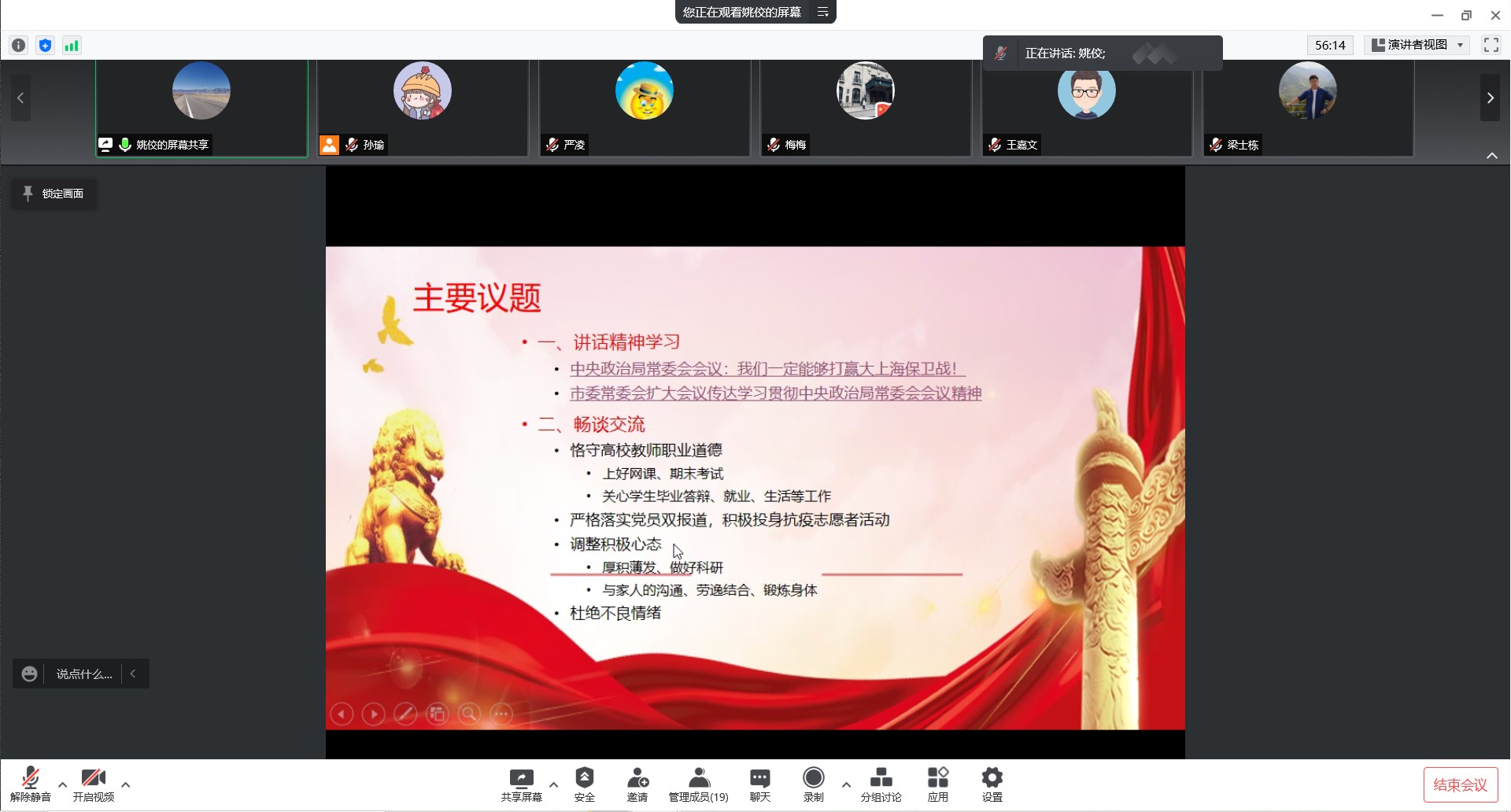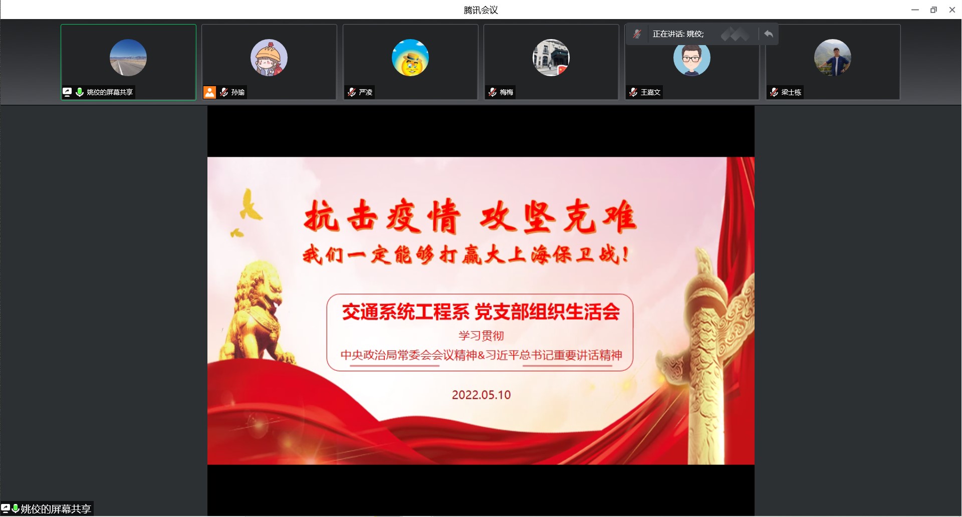 教学工作会议结束后,紧接着全系党员教师围绕“我们一定能够打赢大上海保卫战”抗疫形势的主题开展了线上组织生活会。会议由党支部书记姚佼老师主持,围绕学习和贯彻习近平总书记和党中央关于“抓紧抓实疫情防控重点工作决策部署”,支部全体党员教师在集体学习相关会议精神的基础上,结合上海高校教师抗疫的实际,就“恪守高校教师职业道德,做好本职工作”、“积极投身抗疫志愿活动”、“调整积极心态、杜绝不良情绪”等话题展开了交流讨论。通过此次组织生活会,全体党员凝聚了力量,坚定了信心,达成了“筑牢群防群控防线,紧紧依靠群众打赢防疫阻击战”的共识。