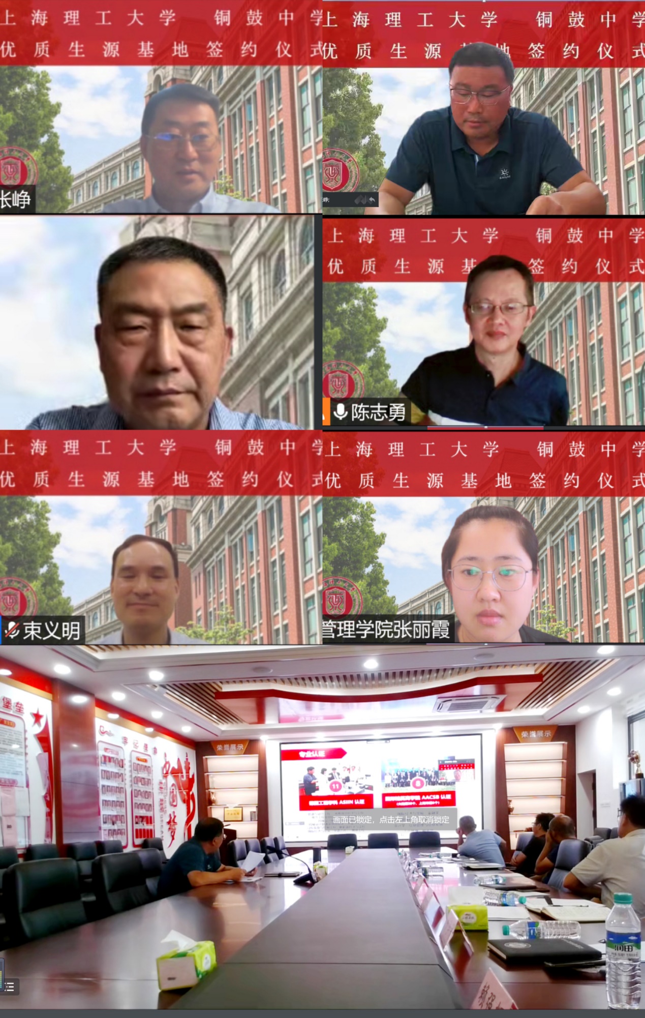 7月15日下午,我院代表学校举行上海理工大学-江西省铜鼓中学云端“优质生源基地”签约仪式。江西省铜鼓中学党总支书记校长叶松源,副校长罗伟、刘强、徐国荣,副书记蔡峻;我院副院长张峥,会计系主任赵洪进、副系主任陈志勇,本科教务办主任束义明以及教学秘书张丽霞出席仪式。签约仪式由陈志勇主持。