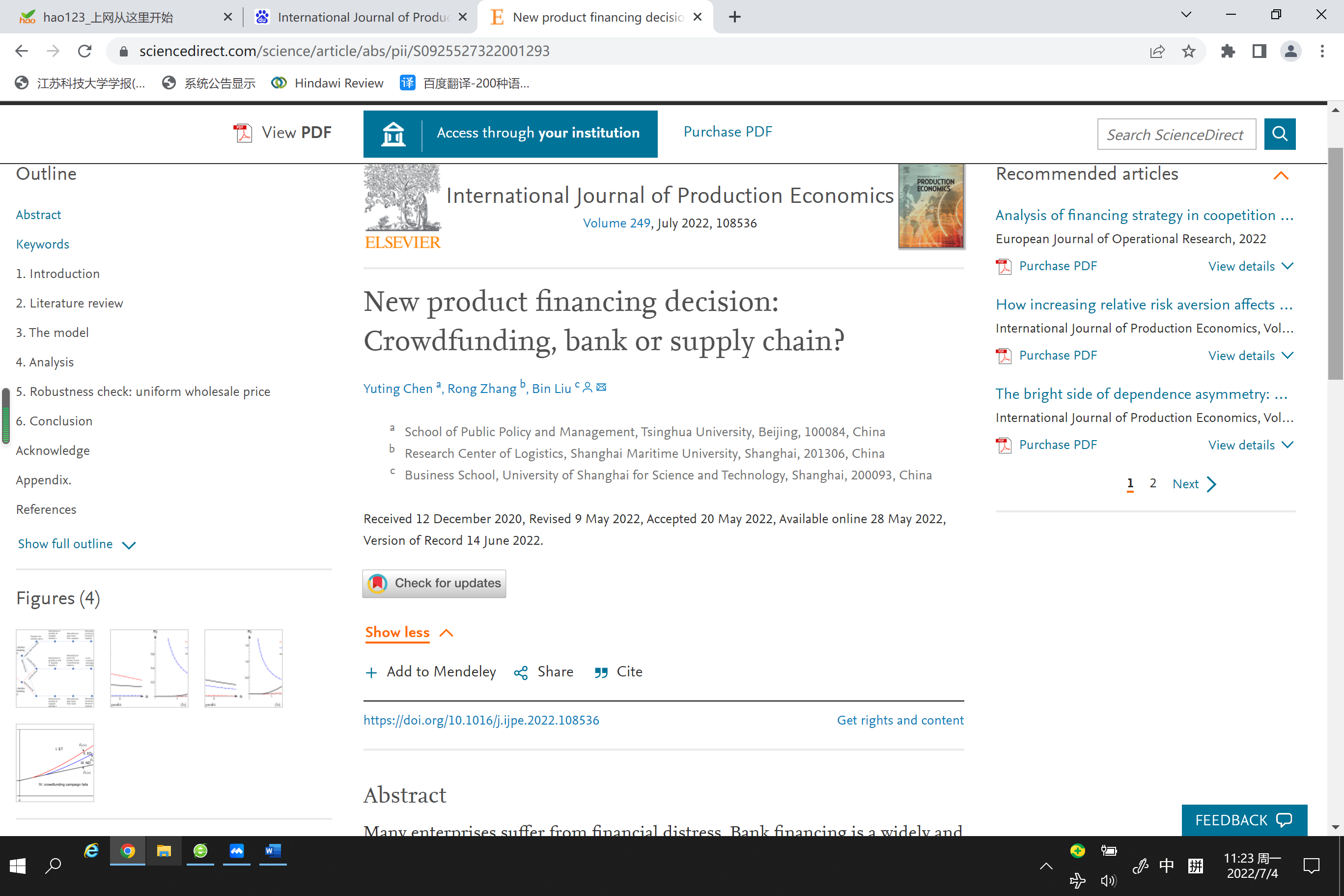 近日,管理学院刘斌教授团队在国际权威期刊 International Journal of Production Economics (中科院一区,Top期刊,IF=11.251,ABS 三星期刊,在运筹学和管理科学领域期刊中排名第3/99)上发表论文《New product financing decision: Crowdfunding, bank or supply chain?》。刘斌教授为该论文的通讯作者,博士生陈雨汀为第一作者(目前为清华大学博士后)。