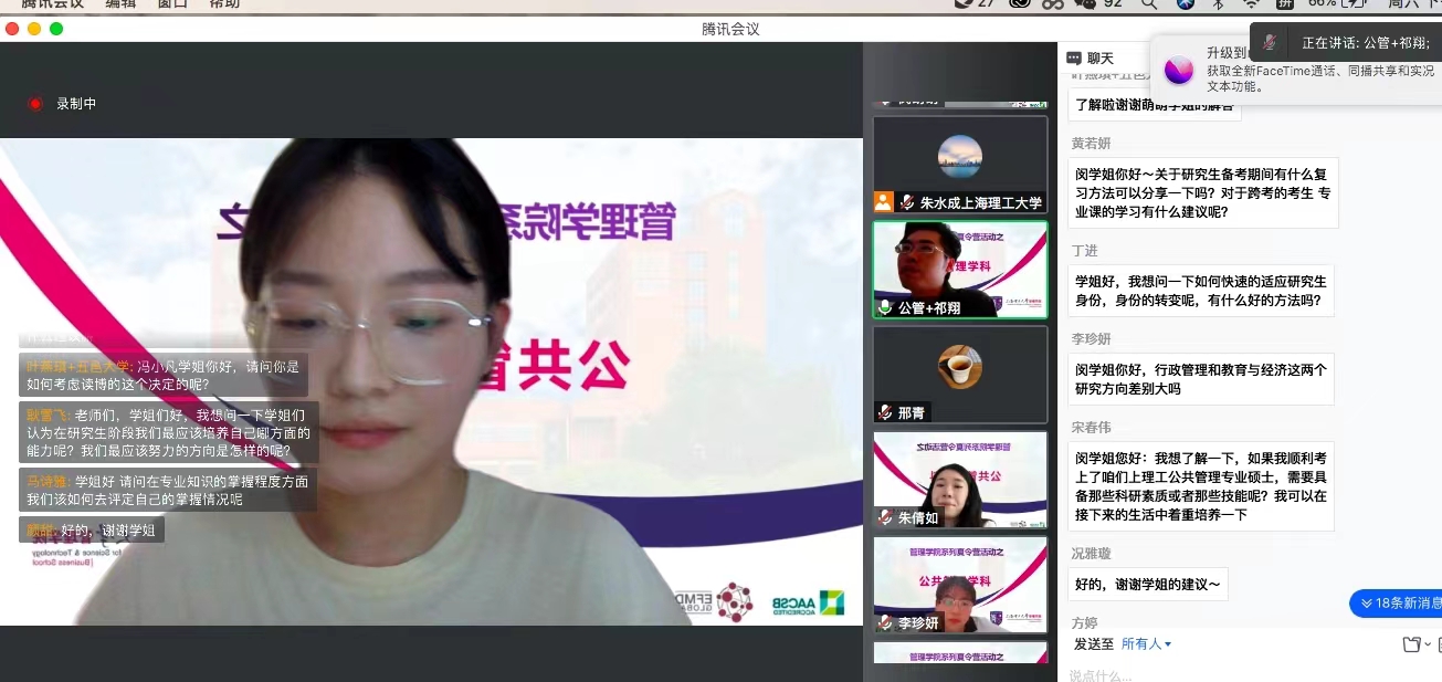 闵萌萌同学从科学研究、项目实践、社会实践等角度分享了自己在上理公管读研的两年心路历程和自我成长过程。她提到,在学院平台和导师的帮助和鼓励下,自己开始勇于突破、敢想敢做,不仅积累了更多的专业知识,还收获了参与抗疫一线、创设了“微耕心”党建品牌等宝贵的成长经验。