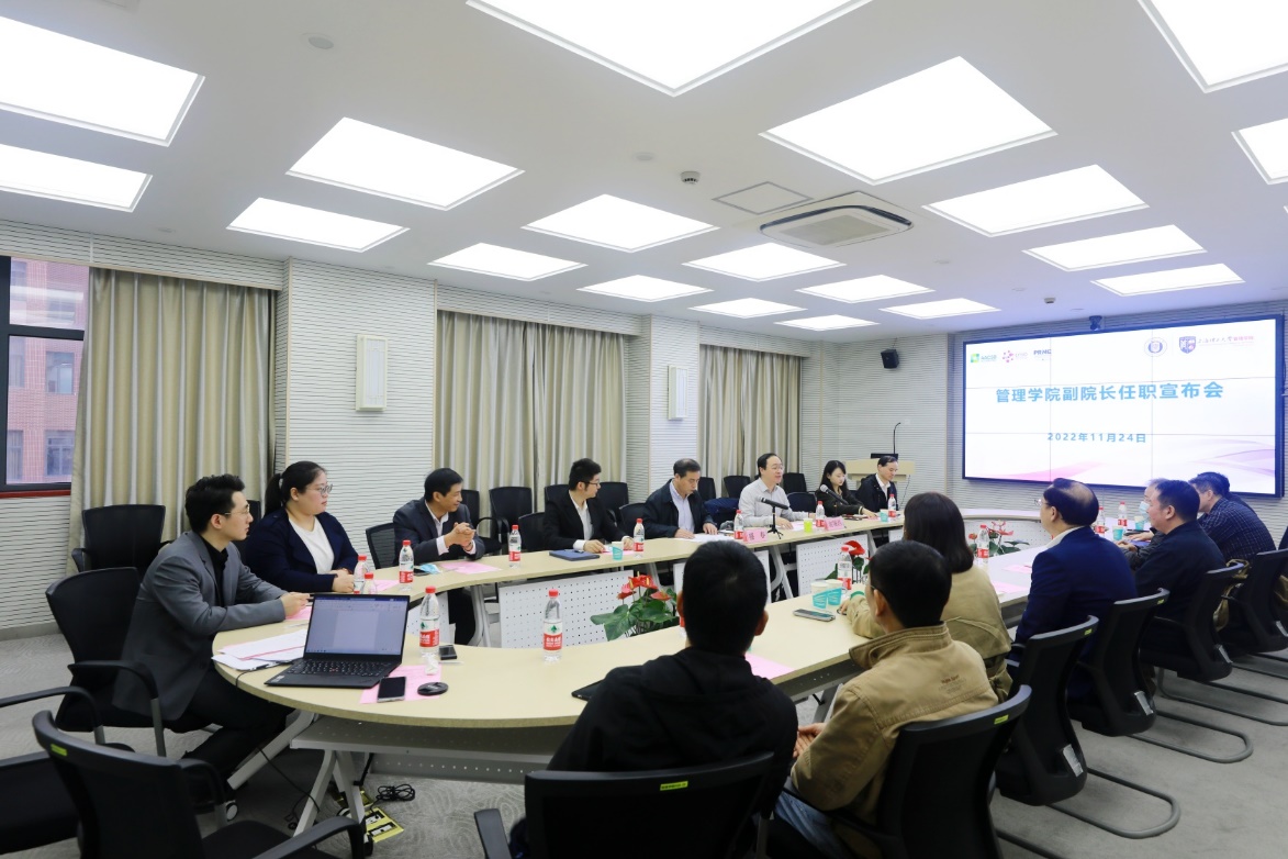 2022年11月24日上午,校党委副书记、副校长盛春,党委组织部副部长谢锡浩一行来到管理学院召开学院副院长任职宣布会。学院党政领导班子成员、学科带头人、支部书记、部门负责人及一线教师代表等参加了会议。会议由谢锡浩主持。