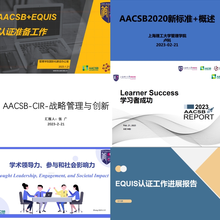 国际认证团队成员对AACSB新标准进行了概述,阐明了报告的总体思想和原则,围绕AACSB认证报告中“战略管理及创新”“学习者成功”“学术领导力、参与和社会影响力”等部分对报告内容进行了汇报。然后,从EQUIS认证简介、流程、特点和数据表填写汇报了EQUIS认证工作进展。