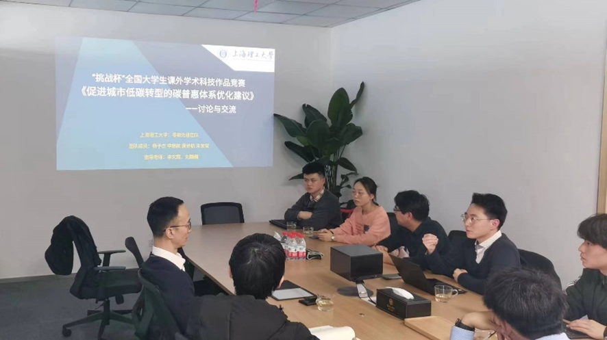 首先,池晓彬向团队介绍了公司及其产品的基本情况。作为国家数字人民币试点落地机构和标准组成员企业,该公司研发运维了全国首款以数字人民币结算的青岛市碳普惠平台“青碳行”与上海市碳普惠平台“沪碳行”,致力于促进居民绿色低碳出行,助力“双碳”目标的实现。随后,刘魏巍老师向对方介绍了上海理工大学及交通系统工程系的基本情况,展示了我校在科学研究、人才培养和社会服务方面的成绩。接着,李文翔老师重点介绍了团队在低碳交通领域的研究成果,并针对目前的碳普惠产品提出了优化思路与建议。同时,学生代表杨子杰还汇报了团队在“挑战杯”大学生课外学术科技作品竞赛中关于低碳社区的调研成果。池晓彬对我校团队取得的成果表示认可,并表达了合作意向。最后,双方就联合推广碳普惠平台、共同申报研究课题、共建实习实践基地等校企合作事项进行了深入的探讨。