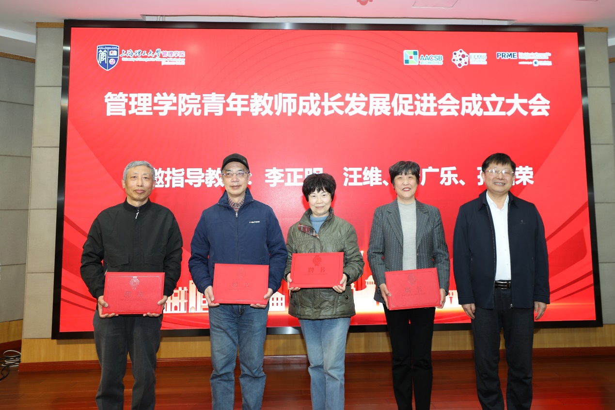 赵靖宣读管理学院青促会的组织架构,随后,由张华向李正明、汪维、严广乐、孙绍荣颁发特邀指导教师聘书。张华、赵来军共同为管理学院青促会揭牌。