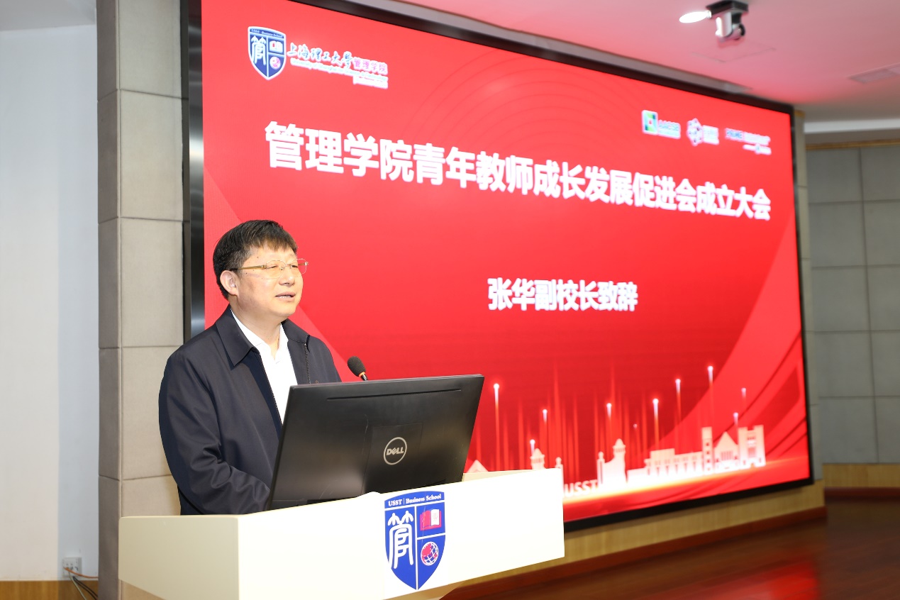 张华代表学校向管理学院青促会的成立表示热烈祝贺,肯定了管理学院成立青促会具有深远的意义。他表示,青促会的成立能够更好地促进青年教师由博士生向教师的转变,为青年教师上好课、站好岗提供更好的条件,体现了管理学院在教师发展和教育改革中迈入新阶段。他对青年教师成长发展提出了几点期待:第一,要注重专业成长、提升教育教学质量。第二,要树立持续发展观念,锤炼自己的职业心理素质。第三,要关注自身全面发展,强化社会责任感。