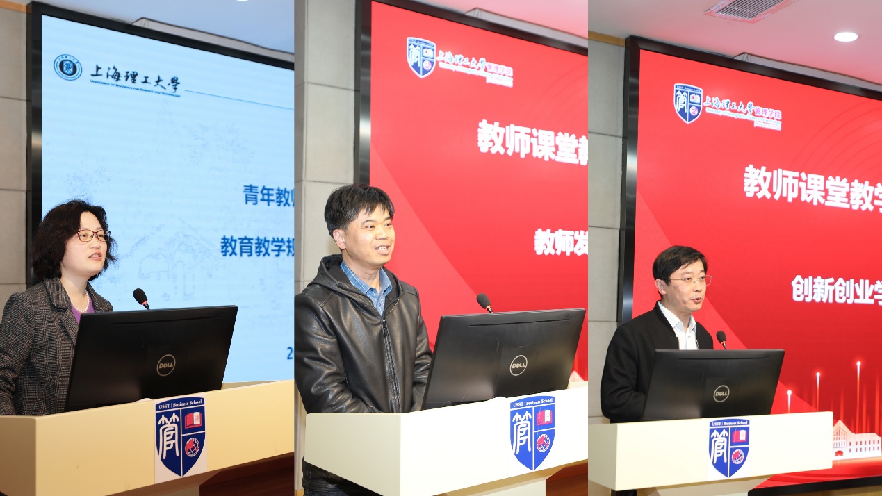 黄烜就青年教师关心的教学问题从本科教学基本情况、教育教学规范、教育教学能力考核等方面进行详细的介绍;童元伟重点介绍了教师发展中心的职责以及在教师发展过程中的作用,希望广大青年教师能够在青促会的指导下,不断提升自身素养;李臣学表示创新创业学院目前整合学校创新创业教育资源,构建创新创业教育体系,统筹开展创新创业教育工作,积极引导和培养学生的创新意识,激发创新思维,同时也希望管理学院的青年教师能够积极地加入到创新创业教育中。