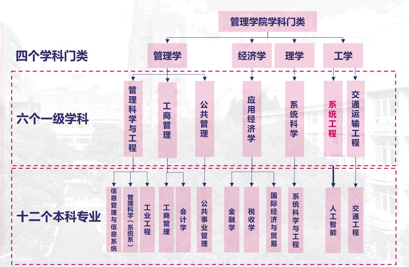 学院深刻把握和科学运用系统思维和系统方法,已实现多类型、多层次办学模式,涉及经、管、理、工等4个学科门类。2022年获批系统科学与工程新工科本科专业,系统科学形成本-硕-博完整人才培养体系。系统科学学科作为全国最早建立的同类学科之一,现为上海市高水平大学重点建设学科。