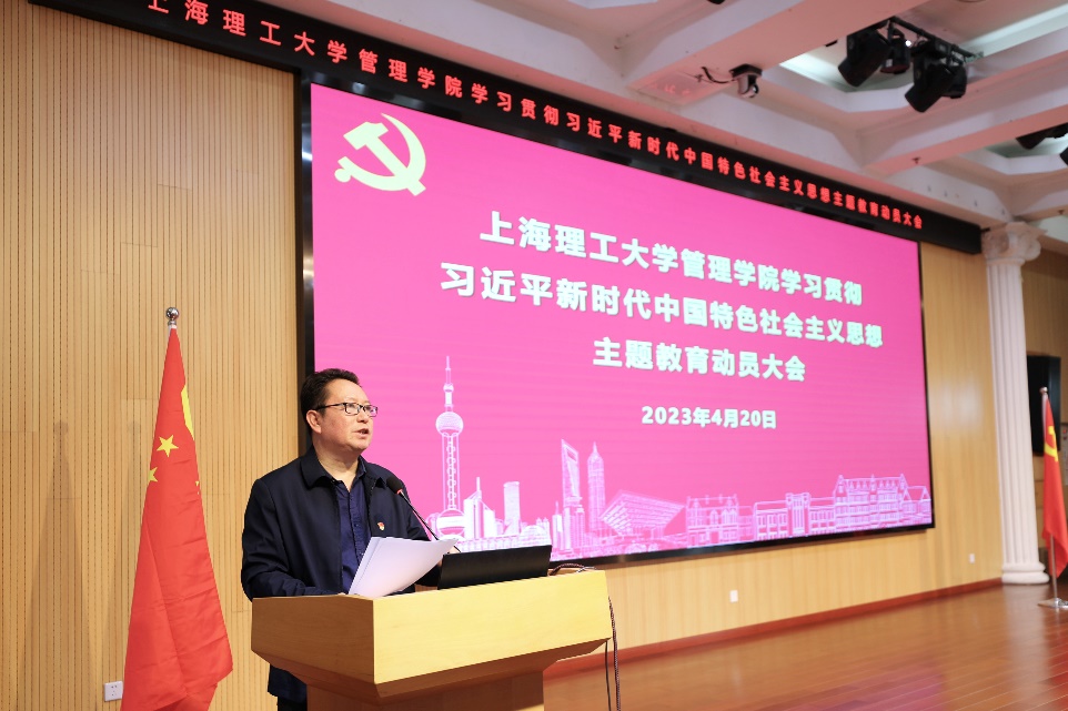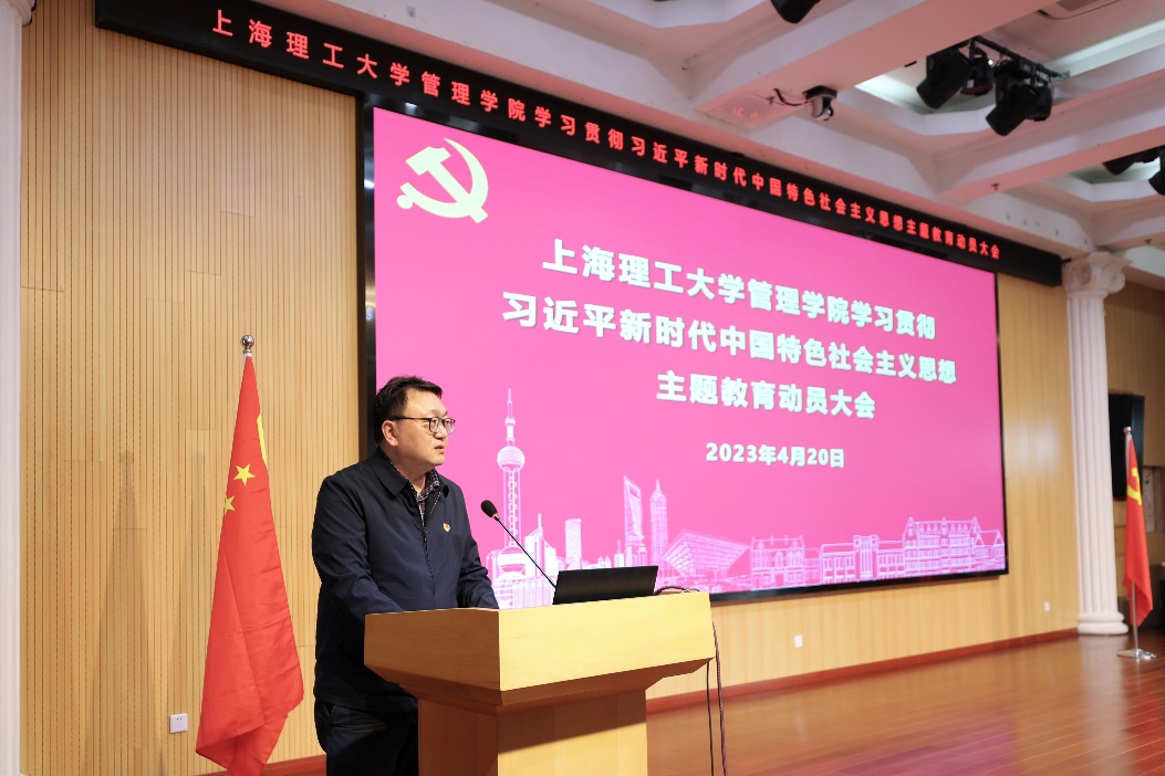马静波同志表示,在全党深入开展学习贯彻习近平新时代中国特色社会主义思想主题教育,是党中央的重大决策,是贯彻落实党的二十大精神的重大举措。要牢牢把握主题教育“学思想、强党性、重实践、建新功”的总体要求和“学思用贯通、知信行统一”的根本任务,用习近平新时代中国特色社会主义思想凝心铸魂,以主题教育为契机,切实把开展主题教育成果转化为学院改革发展的动力,加快国际一流精英商学院建设步伐,奋力谱写中国式现代化建设的上理管院新篇章。马静波同志传达校长丁晓东同志在上海理工大学党委学习贯彻习近平新时代中国特色社会主义思想主题教育动员大会上的讲话精神,并介绍了管理学院主题教育实施方案的五个具体要求。第一,加强理论学习,进一步凝心铸魂强化忠诚。第二,深入调查研究,进一步转变作风提高本领。第三,推动高质量发展,进一步服务大局开拓新局。第四,深刻检视整改,进一步查摆不足改进提高。第五,注重建章立制,进一步拓展成果常态长效。