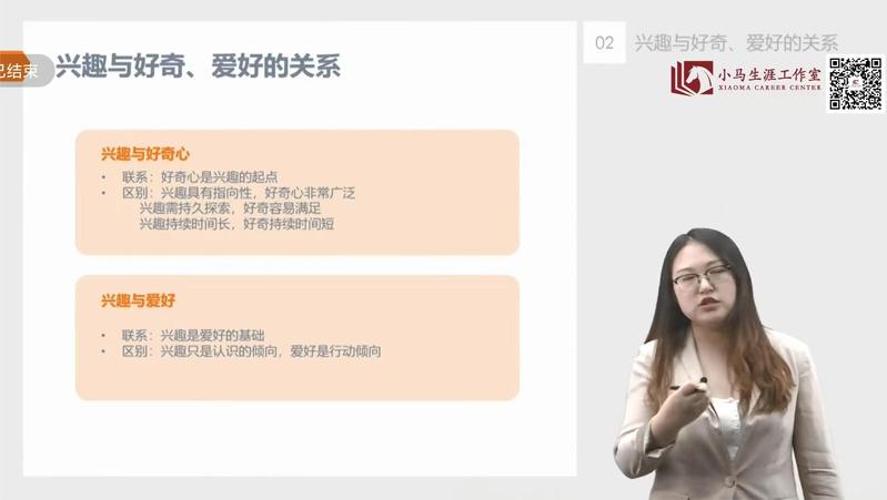 本次录播课的主题是“发展你的兴趣爱好”,课程划分为四个模块:兴趣的缘起及主要作用、如何探索自己兴趣、如何发展自己的兴趣和职业兴趣,以逻辑顺序展开阐述。以第一模块为例,老师阐述了兴趣的定义为一种意识倾向,表现为一种选择性态度和积极的情绪反应,解析了兴趣的特点,与好奇、爱好各自的联系与区别,以及兴趣的四大功能和其产生的多个原因,最后回顾了本节课的核心要点。以兴趣的相关概念为铺垫,老师进而讲解后续课程,运用科学的分析和形象的例子阐明了主题,助力大家了解自身并将兴趣运用至职业中。