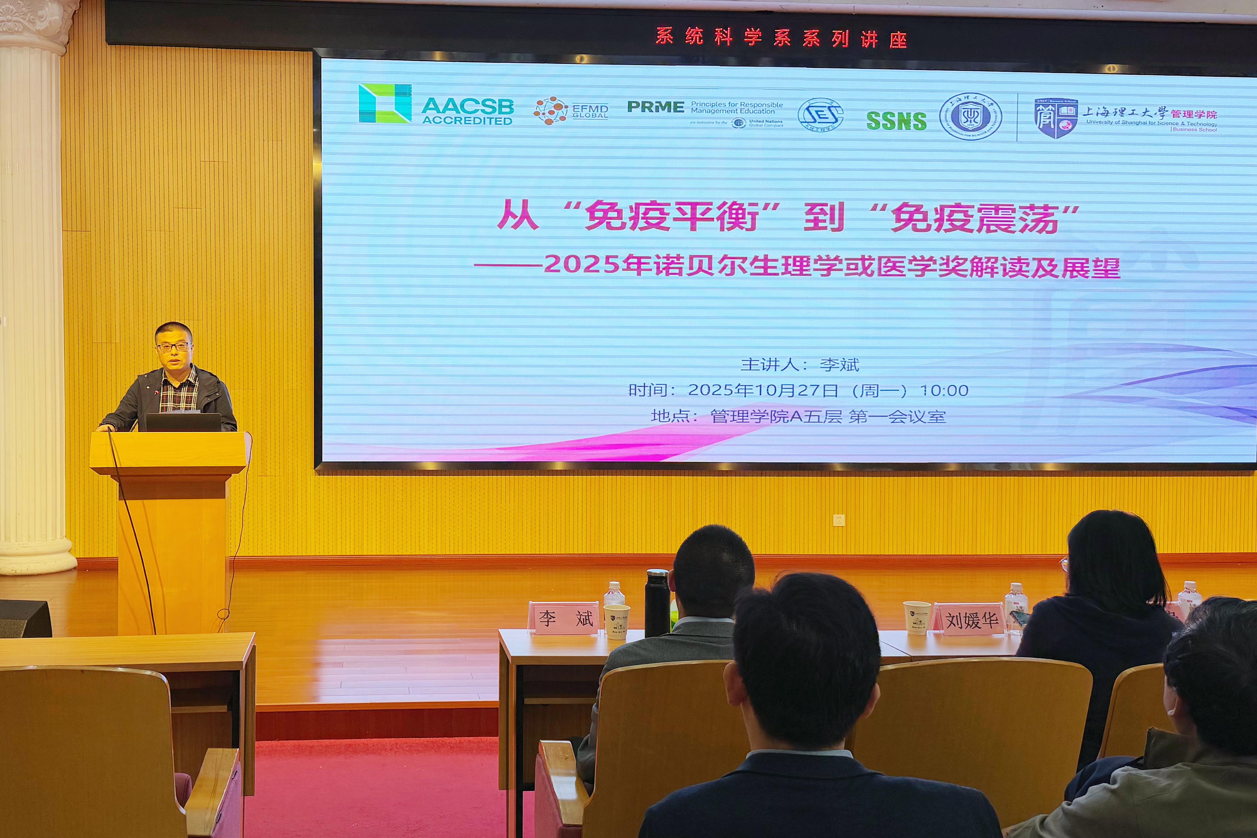 2025年10月27日下午,上海理工大学科技发展研究院、管理学院主办,系统科学系承办的系列专题讲座,特邀上海交大医学院上海市免疫学研究所研究员李斌担任主讲,分享题为《从“免疫平衡”到“免疫震荡” ——2025年诺贝尔生理学或医学奖解读及展望 》的学术报告。讲座由系统科学系系主任顾长贵主持,吸引了全校200多名师生积极参与。