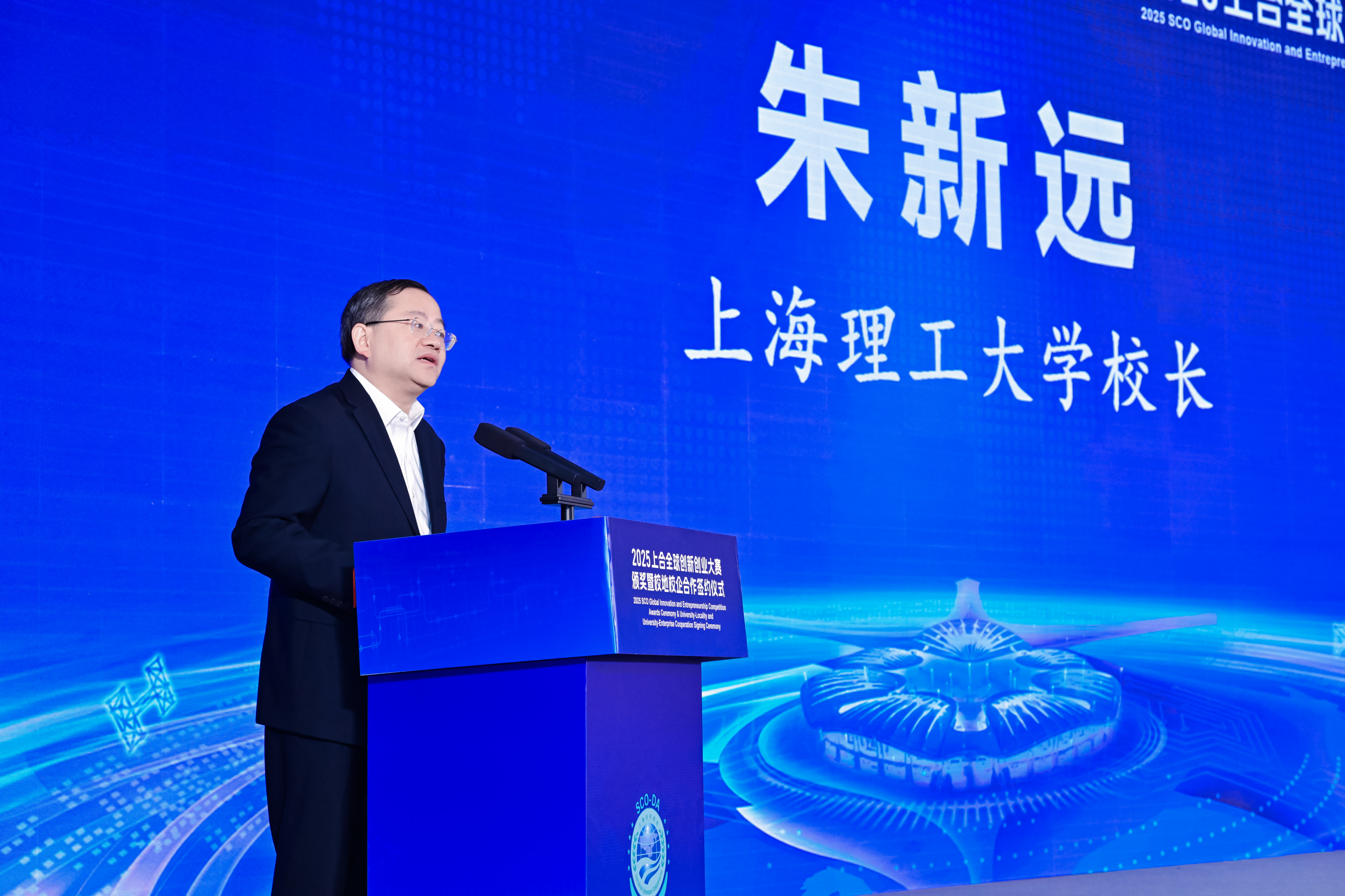 朱新远在致辞中代表学校向大赛的顺利举办表示祝贺。他介绍了学校以新一轮综合改革试点为牵引,积极布局生物医学、人工智能、城市治理等前沿领域,持续增强创新策源能力,助力学校加快建设一流创新型理工科大学。他还回顾了学校与上合示范区的合作历程,并指出,学校将以新一轮校地合作协议签署为契机,重点围绕产学研平台共建、智慧应急创新、人才生态闭环构建和校友资源整合等四个方面深化协同,为上合组织地方经贸合作注入“上理智慧”。