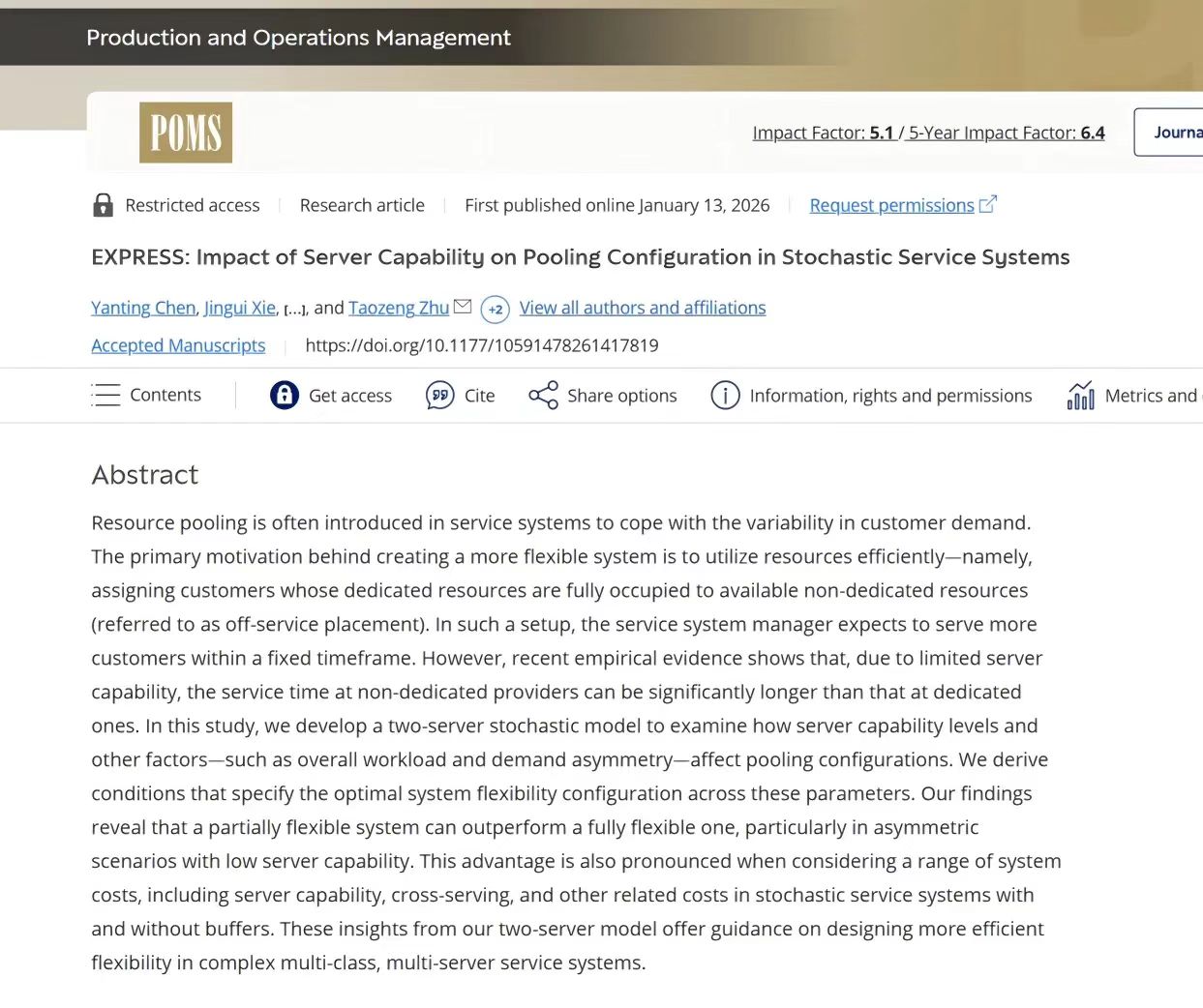 近日,上海理工大学管理学院陈燕婷副教授的研究成果以“随机服务系统中服务提供者的能力对共享设计的影响”(Impact of Server Capability on Pooling Configuration in Stochastic Service Systems)为题发表在国际顶级期刊《生产与运营管理》 (Production and Operations Management)上。该期刊是国际公认的管理学顶尖期刊之一,该期刊被列入UTD24(美国德克萨斯大学达拉斯分校商学院认定的24种权威学术期刊)之一,在国际管理科学界享有极高的学术声誉。该研究成果的第一作者为上海理工大学管理学院陈燕婷副教授,合作者包括慕尼黑工业大学Jingui Xie副教授、Nan Yang博士生、西华盛顿大学Zhe George Zhang教授以及东北财经大学Taozeng Zhu副教授。