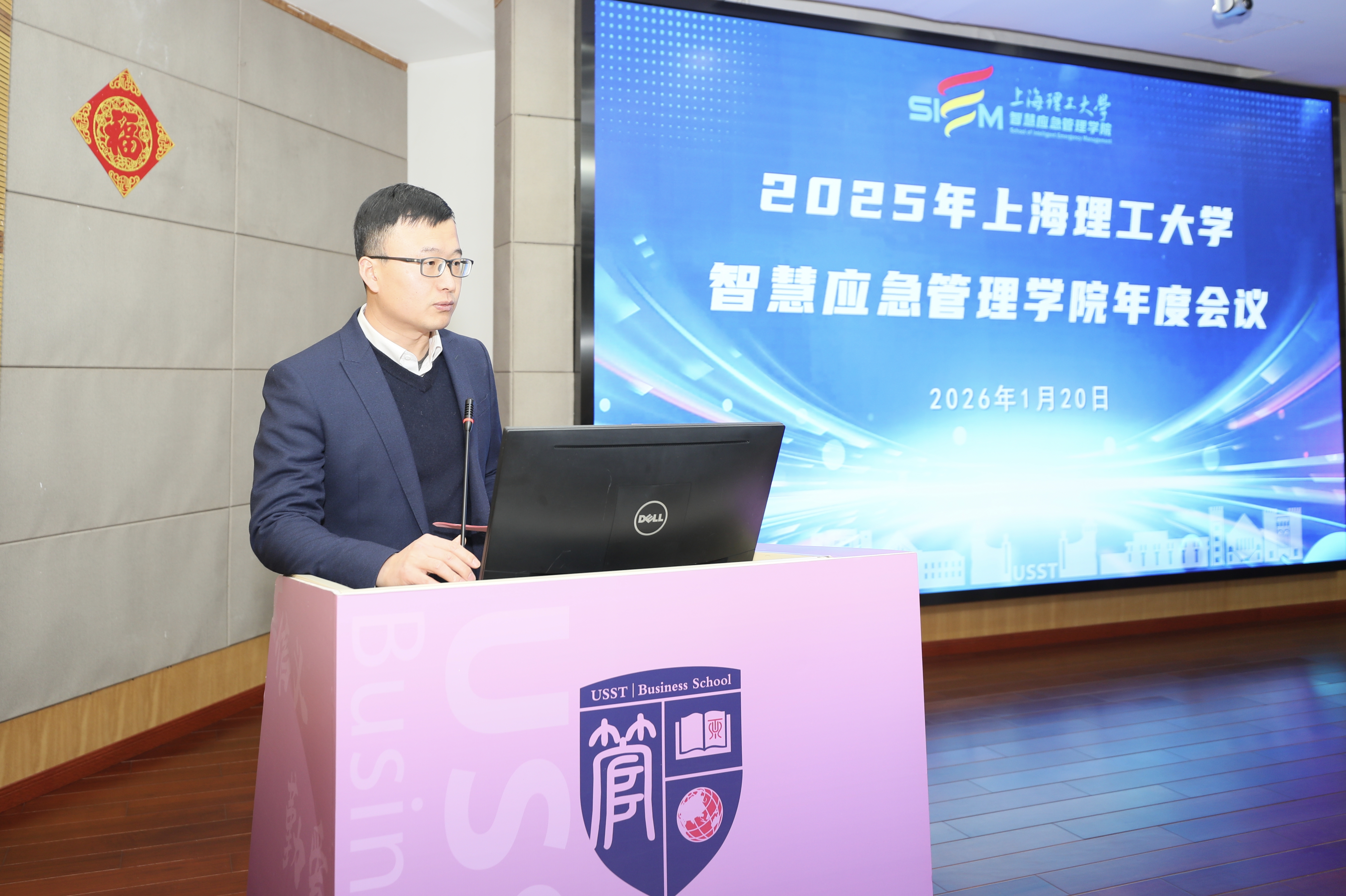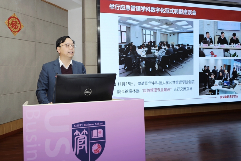 管理学院院长、智慧应急管理学院院长赵来军作学院2025年度工作汇报。他全面总结了学院在科学研究、合作交流、人才培养和社会服务等领域取得的进展,并展望了2026年重点工作。新的一年,学院将重点推进三方面工作:在人才培养方面,将启动上海市首个应急管理本科专业招生,完善MPA课程体系,深化校企合作,选聘企业专家担任兼职导师;在科学研究方面,将组织申报各类课题,持续发挥智库作用;在实验室建设方面,将开展实验室三期建设,并积极申报市级科普基地。学院还将组织参加2026年长三角国际应急博览会,主办“复杂系统的智慧应急管理”主题活动,并通过项目申报、系列培训讲座、年度培育课题评选等工作,务实推进合作,持续提升学院影响力。
