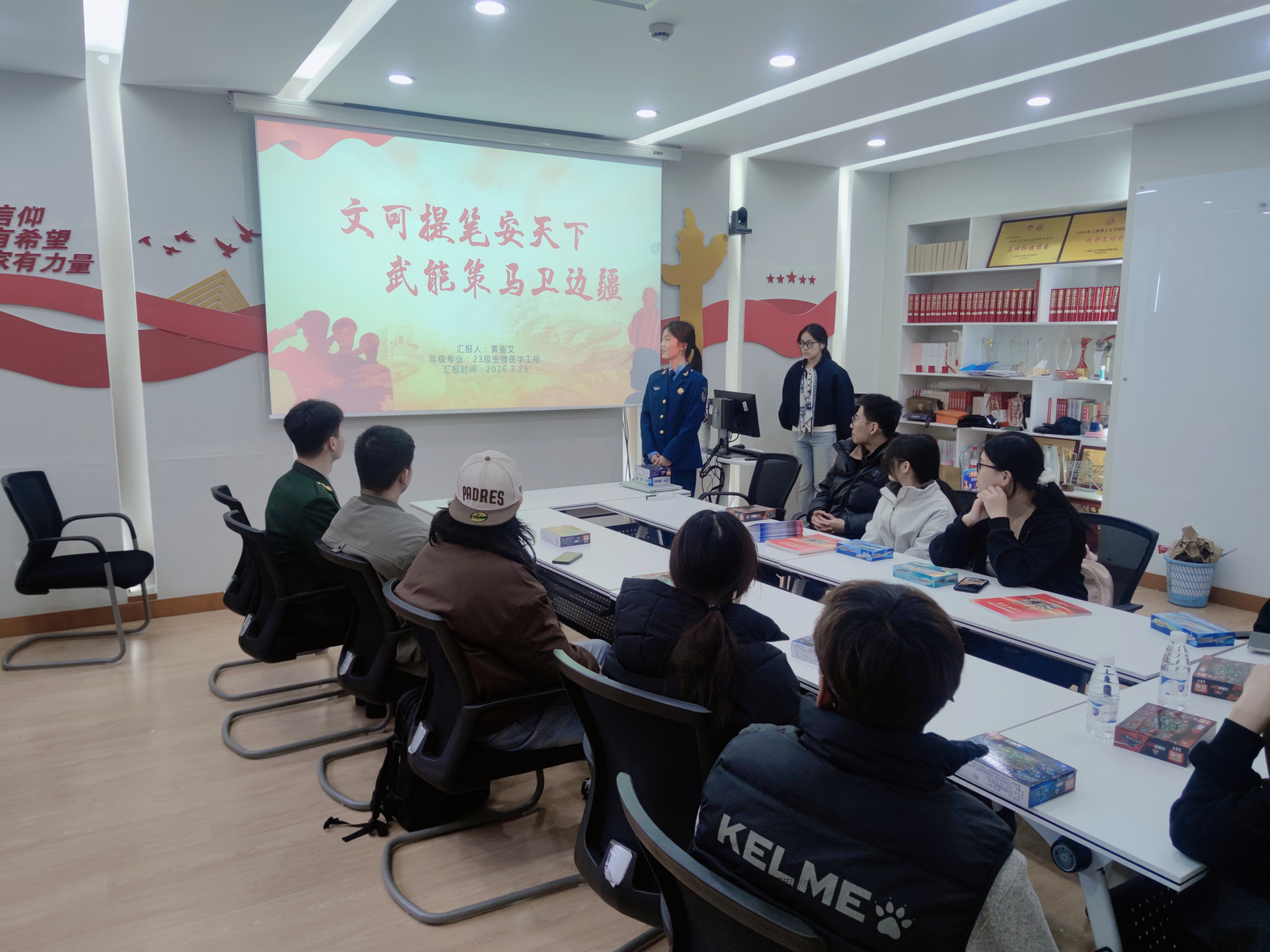 活动伊始,退役复学的黄崔艾学姐以“文可提笔安天下,武能策马卫边疆”为主题,为大家带来了精彩的入伍经验分享。她结合自身在军营的淬炼经历,生动讲述了从高校学子到合格军人的蜕变过程。学姐的分享不仅展现了新时代青年的热血与坚毅,也鼓励在场同学们在早春大好时光里勇于磨砺意志,将个人理想融入国家发展大局之中。