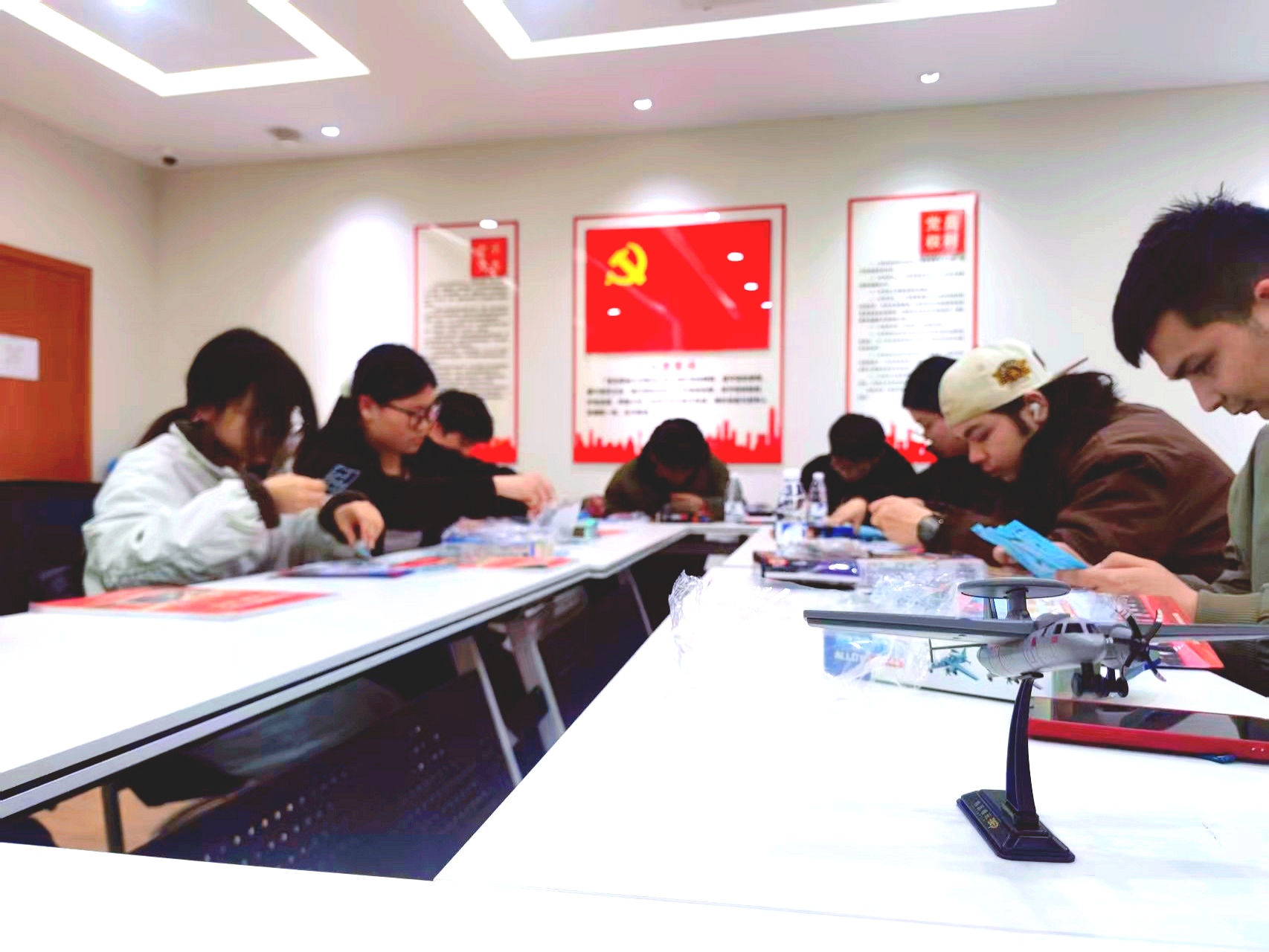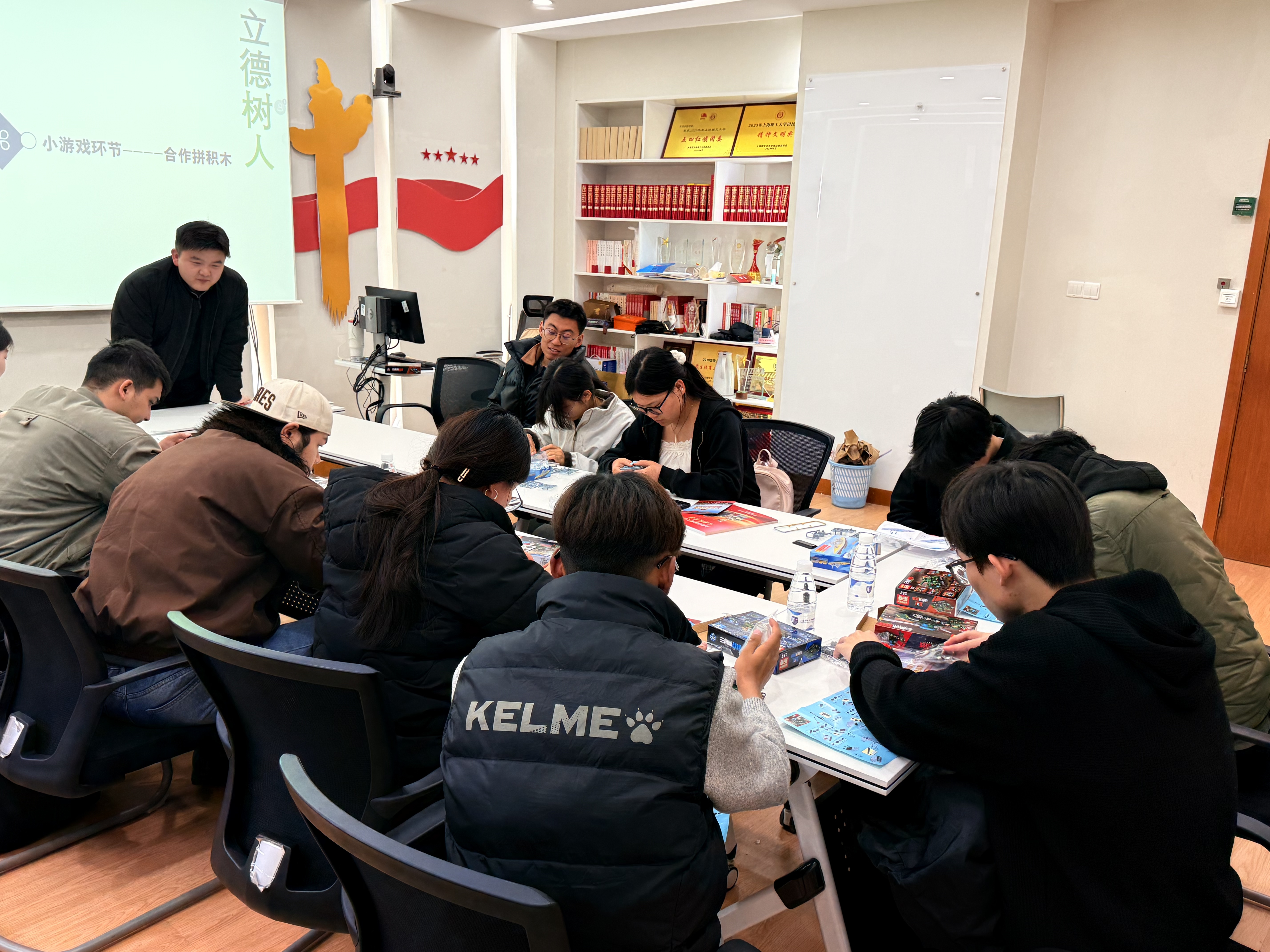 在轻松愉悦的氛围中,活动进入了趣味互动环节。本次活动特别设置了“军事武器积木限时拼”挑战。同学们领取到积木礼品后,迅速分组投入到创作中。大家需要在20分钟内互帮互助、发挥动手能力,完成军事武器模型的拼装成型。