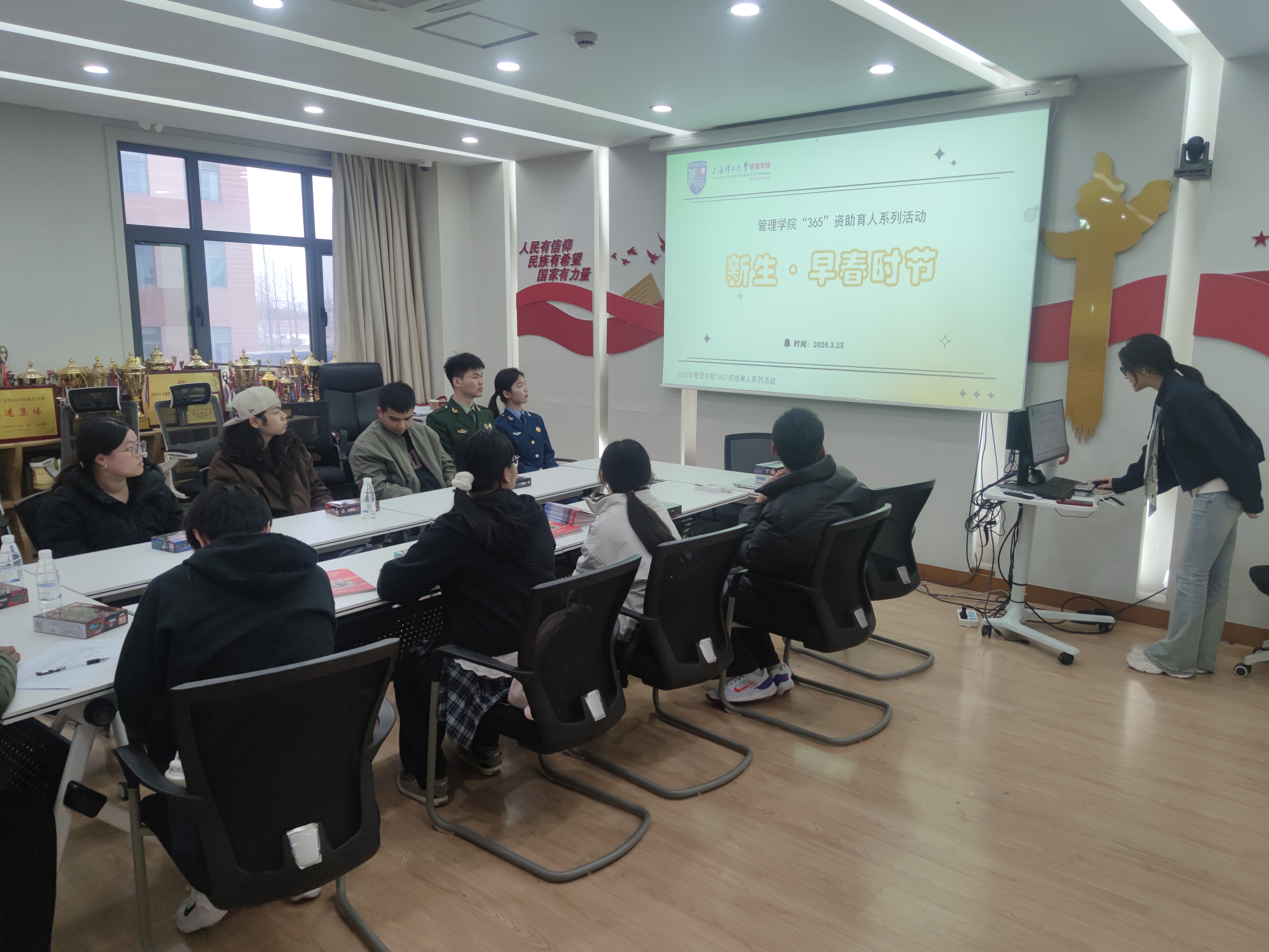 阳春三月,万象更新。为扎实推进资助育人工作,强化学生国防观念与责任担当,3月23日,管理学院举办“365”资助育人系列活动之“新生·早春时节”。本次活动将爱国主义教育与师生交流相结合,通过退伍学子经验分享、师生答疑与趣味互动,旨在帮助同学们在新学期明确目标,汲取奋进力量。