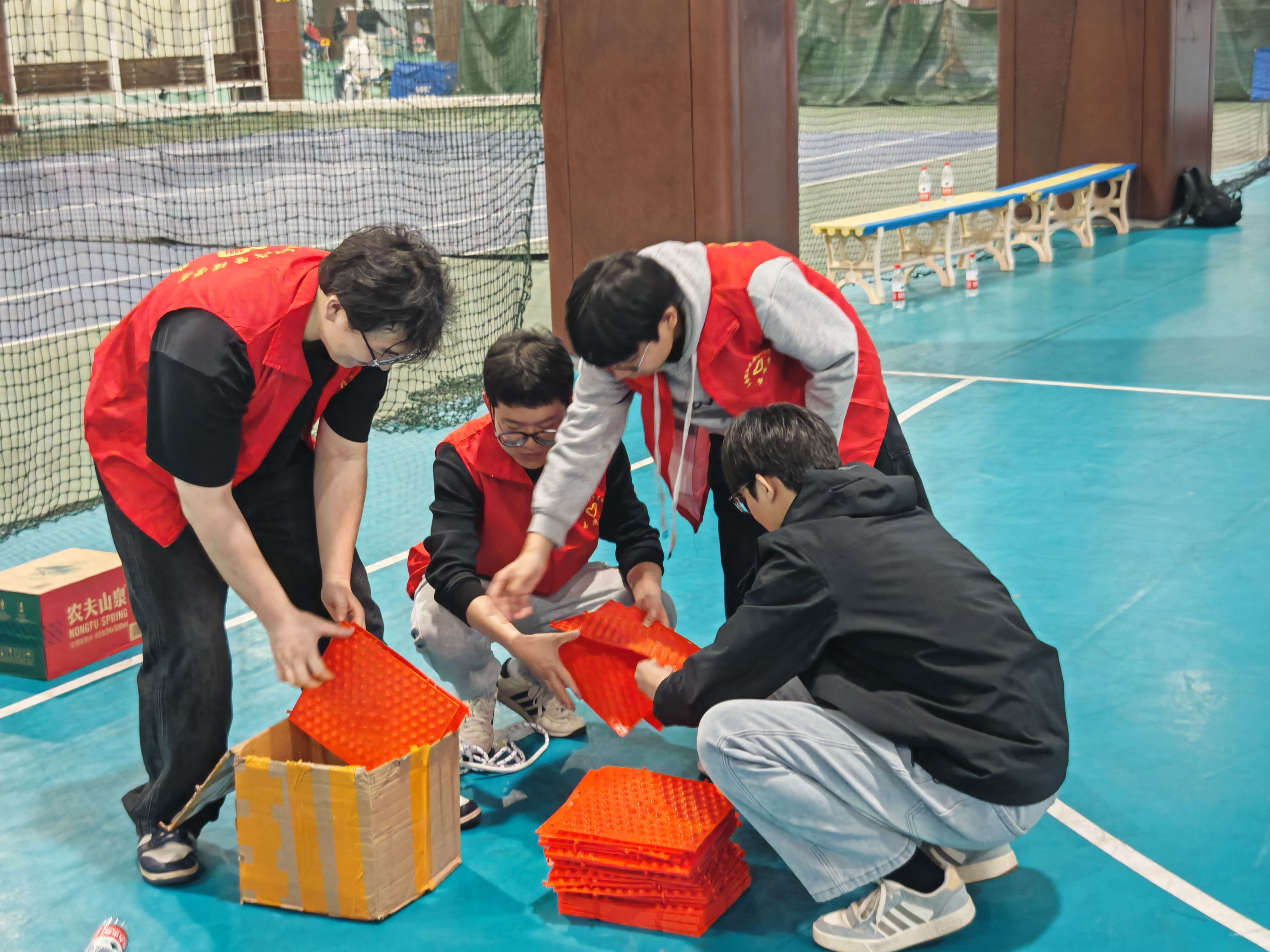 中午12时,支部志愿者们便早早抵达活动地点。在支部书记黄辉老师的带领下,大家迅速分工,投入到紧张有序的赛前准备工作中。一部分志愿者搬运绑带、呼啦圈、PVC管、指压板、运动用水等赛事物资;另一部分志愿者则是在运动场地完成悬挂活动喷绘、布置签到台、划分比赛区域、张贴项目标识、摆放队服等事项,确保每一个环节都不出差错。