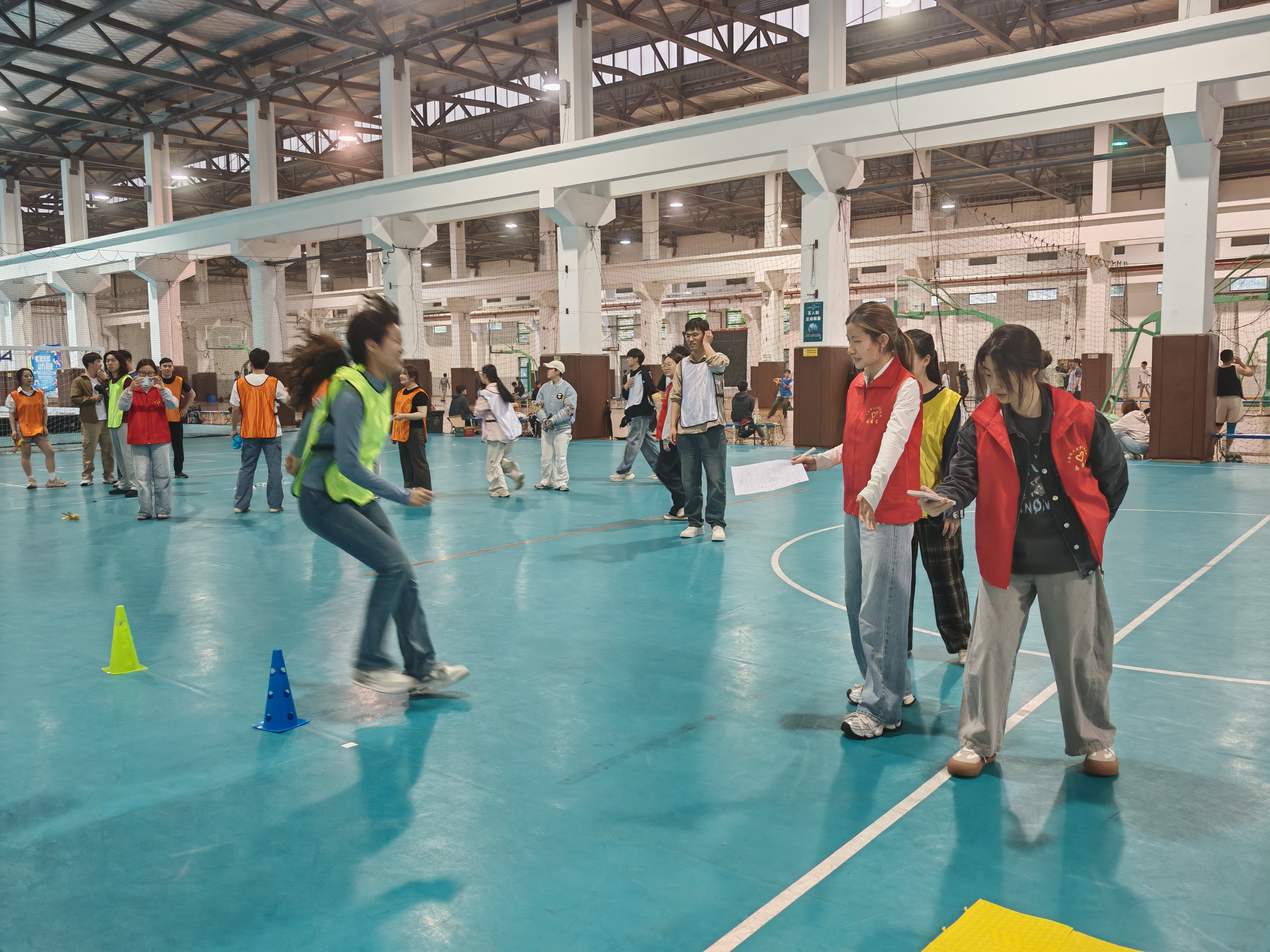 运动会中,支部党员分别担任各项目的裁判、计时员、秩序维护员和后勤保障员及摄影服务员等任务。本次运动会设置了“多人多足”“摸石过河”“一圈到底”“不倒森林”和“趣味接力赛”五个团体项目,兼具协作性与趣味性。在“多人多足”项目中,志愿者俯身仔细检查每一组队员脚踝上的绑带是否牢固,并反复强调“安全第一”。在“摸石过河”接力中,志愿者手持秒表,紧盯队员是否双脚踩砖、有无“落水”,一丝不苟地记录加时情况。“一圈到底”考验柔韧与默契,志愿者们围在圆圈旁,目不转睛地观察队员是否松手或勾圈,一旦犯规立即叫停并指导重新开始。“不倒森林”项目限时3分钟,志愿者们一边计时一边为队员计数成功圈数,不断为队伍加油打气。24级应用经济学党员李婉霜同学担任“不倒森林”项目的裁判,她表示:“作为裁判,我必须公平公正对待每一支队伍。同时,看到大家玩得开心、配合默契,我也感受到了志愿服务的快乐。这不仅是一份工作,更是一份责任。”“趣味接力赛”中,指压板、跳绳、踢毽子、绕障碍物等环节环环相扣,志愿者们在各接力点之间快速移动,确保接力顺畅、成绩有效。比赛过程中,志愿者们不仅是公正的裁判,更是温暖的“后勤员”。有队员在指压板上走得眉头紧锁,25级应用经济学党员秦浩伟同学在旁边笑着鼓励:“坚持一下,马上就到终点!”每一处细节都体现了支部志愿者“服务他人、无私奉献”的真心。