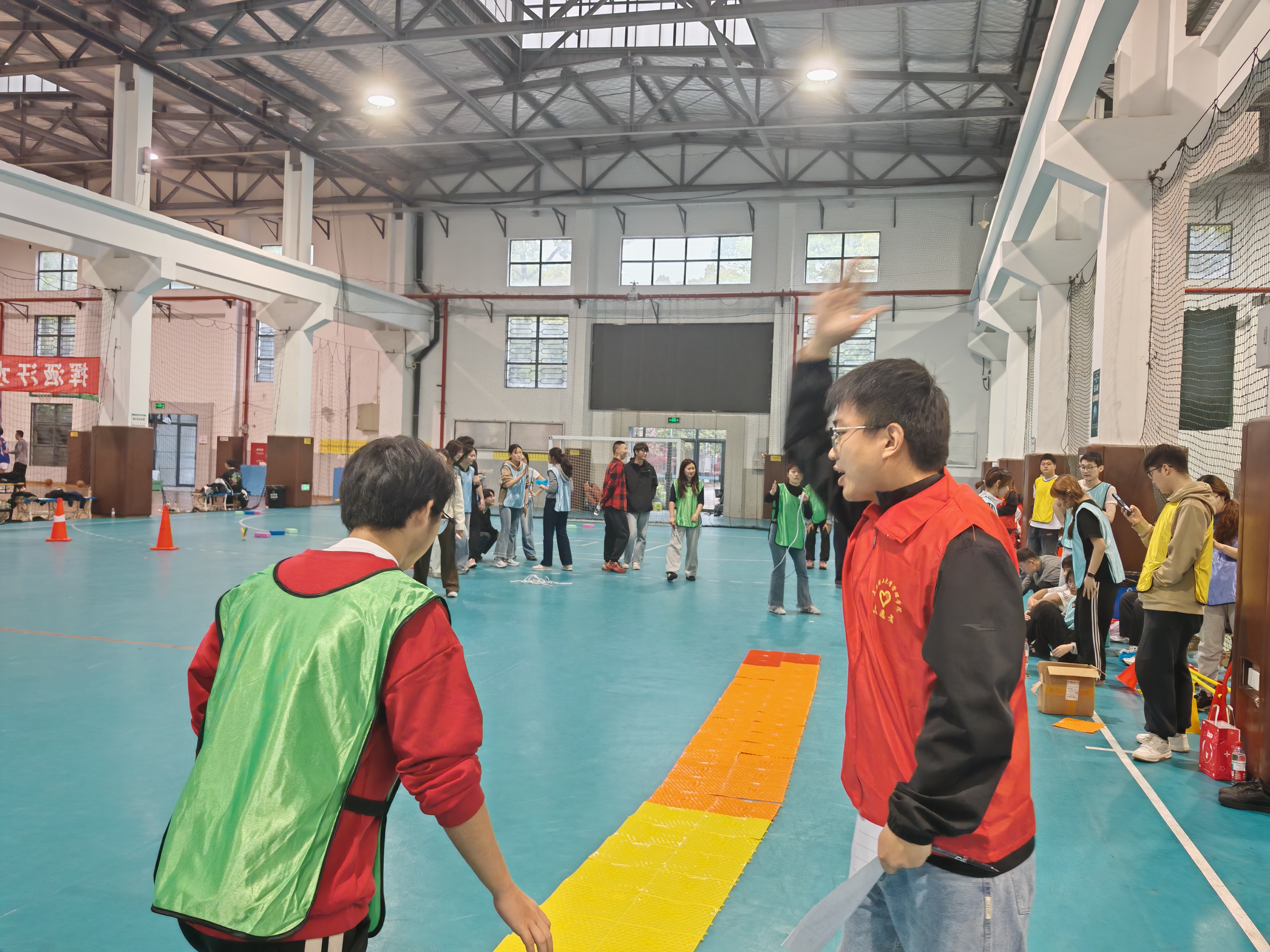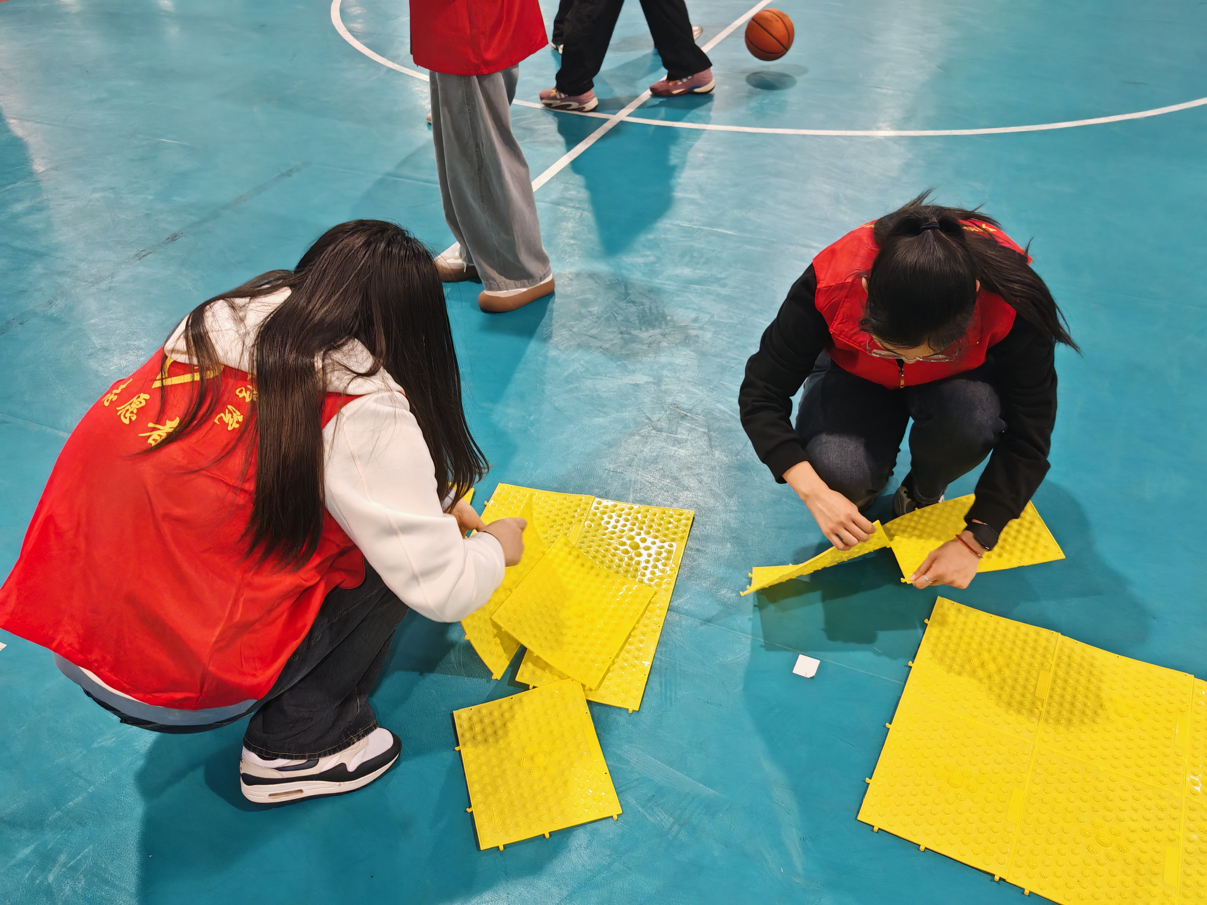 中午12时,支部志愿者们便早早抵达活动地点。在支部书记黄辉老师的带领下,大家迅速分工,投入到紧张有序的赛前准备工作中。一部分志愿者搬运绑带、呼啦圈、PVC管、指压板、运动用水等赛事物资;另一部分志愿者则是在运动场地完成悬挂活动喷绘、布置签到台、划分比赛区域、张贴项目标识、摆放队服等事项,确保每一个环节都不出差错。