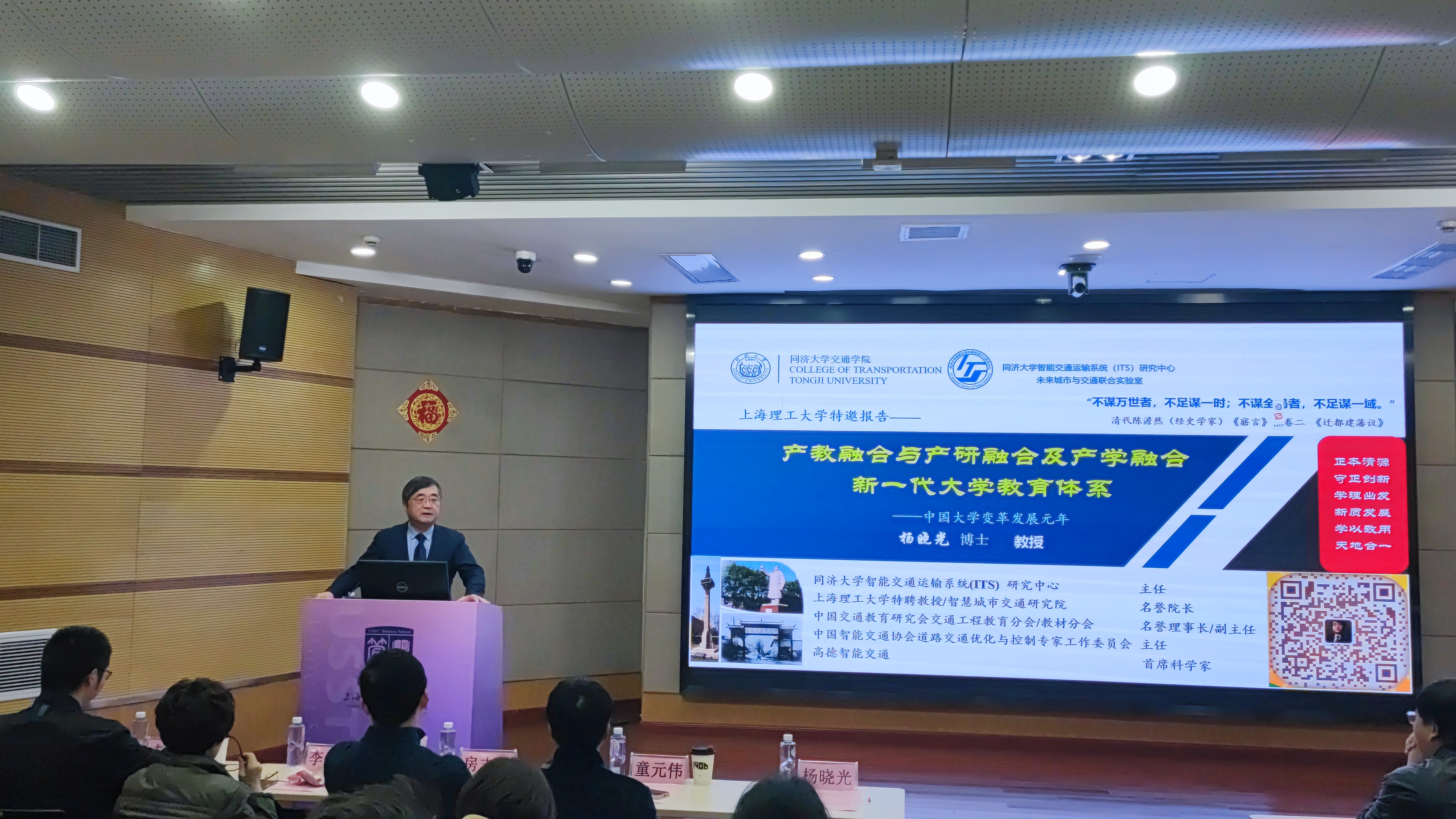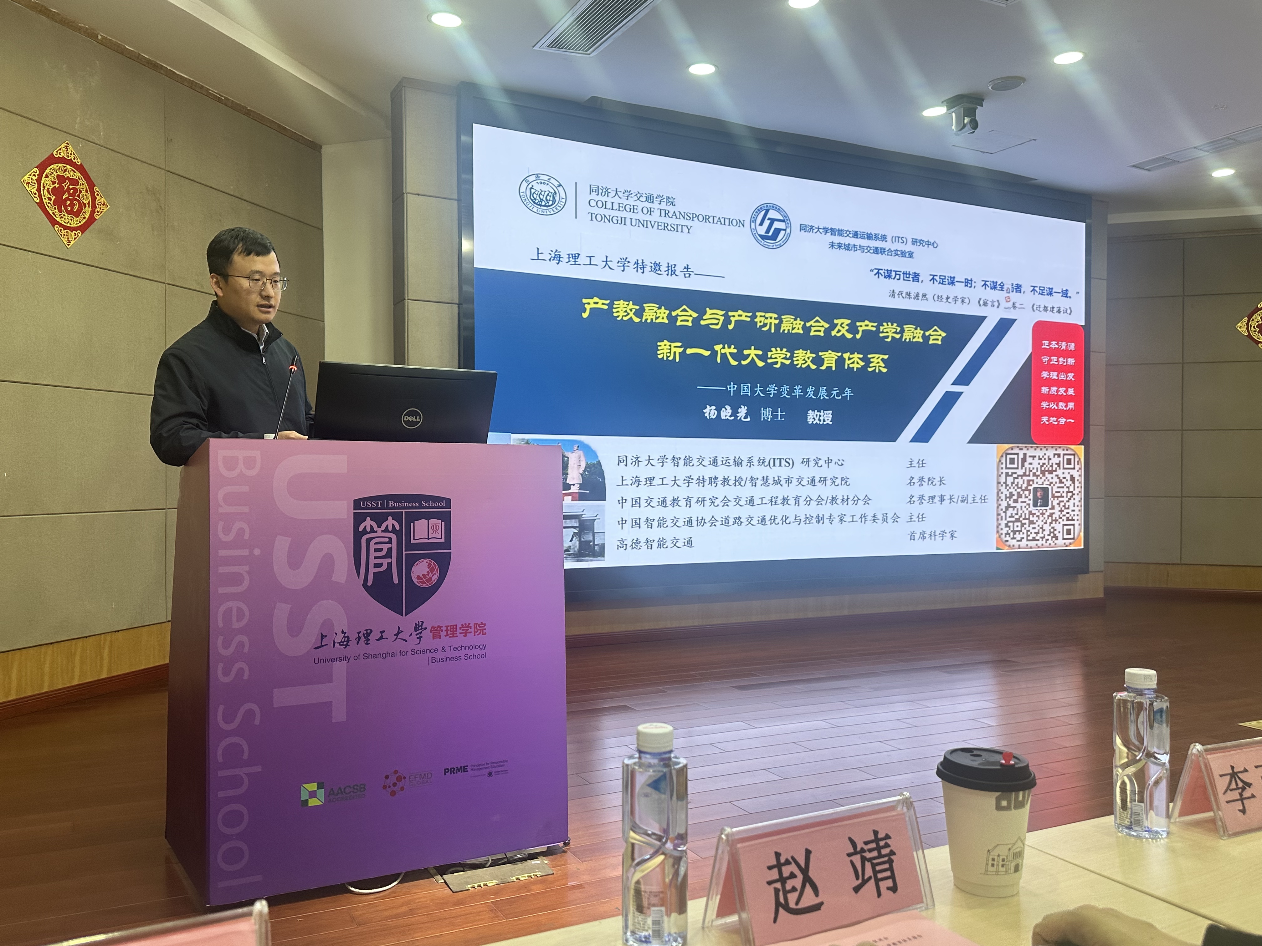 4月23日下午,由教师发展中心主办,管理学院青年教师成长发展促进会承办的“产教融合与产研融合及产学融合新一代大学教育体系”教学创新月活动在管理学院报告厅举行。本次活动邀请了同济大学教授、博士生导师,上海理工大学特聘教授、智慧城市交通研究院名誉院长杨晓光作为主讲嘉宾。教师发展中心主任童元伟、管理学院副院长房志明、赵靖,青促会指导教师李正明,青促会会长刘勤明,副会长李文翔、杨乐以及管理学院青年教师、各学院教师代表参与此次讲座。讲座由房志明主持。
