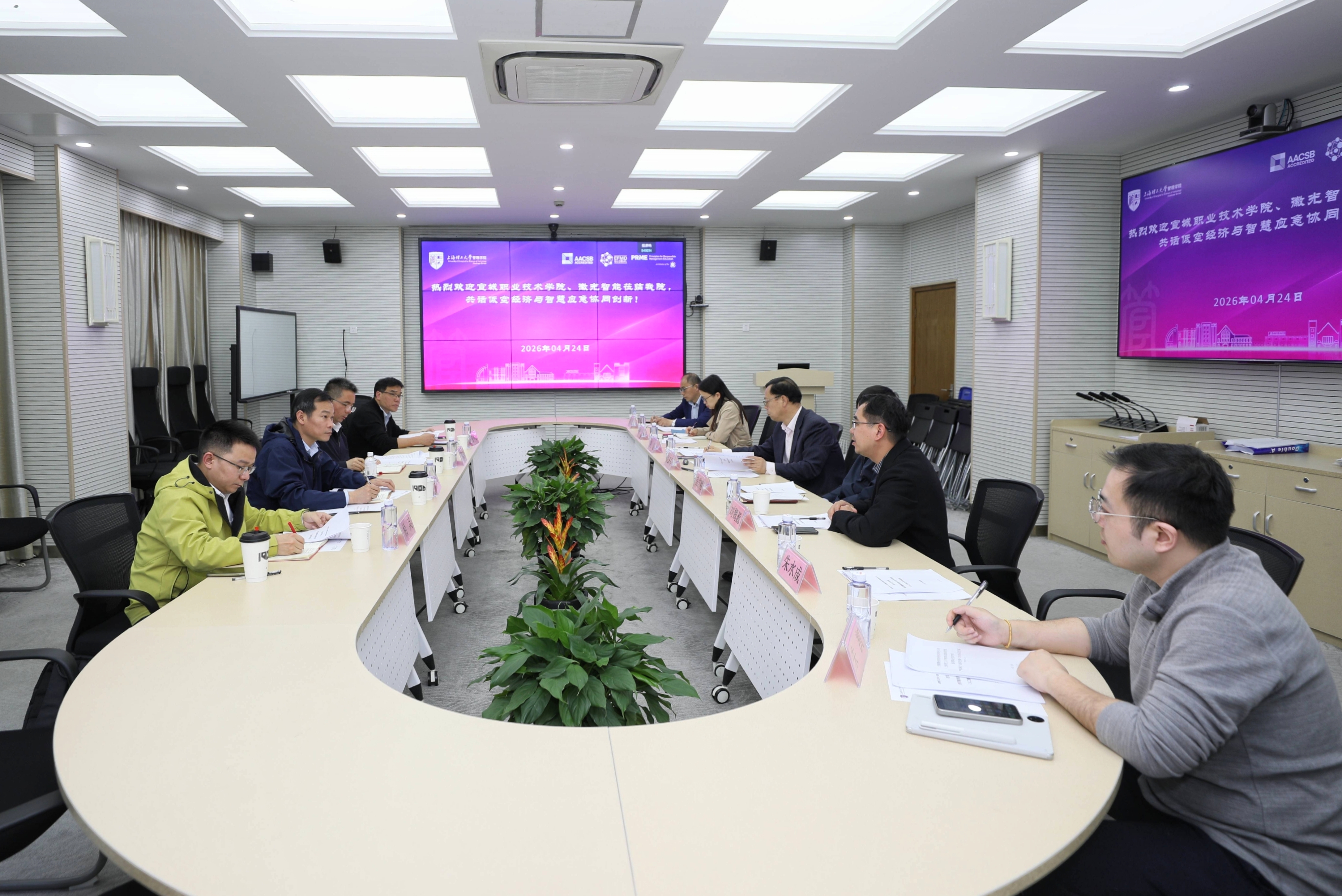 2026年4月24日下午,安徽徽光智能科技有限责任公司总经理裴忠军、科技副总柏兵,宣城职业技术学院副院长蔡冠群、信息与财经学院副院长张小奇一行到访上海理工大学管理学院,就“长三角低空经济与智慧应急协同创新中心”建设及产教融合合作开展交流座谈。上海理工大学管理学院院长、智慧应急管理学院院长赵来军,管理学院副院长、智慧应急管理学院副院长房志明,管理学院副院长刘魏巍,管理学院党委副书记严瑾及相关教师代表参加会议。