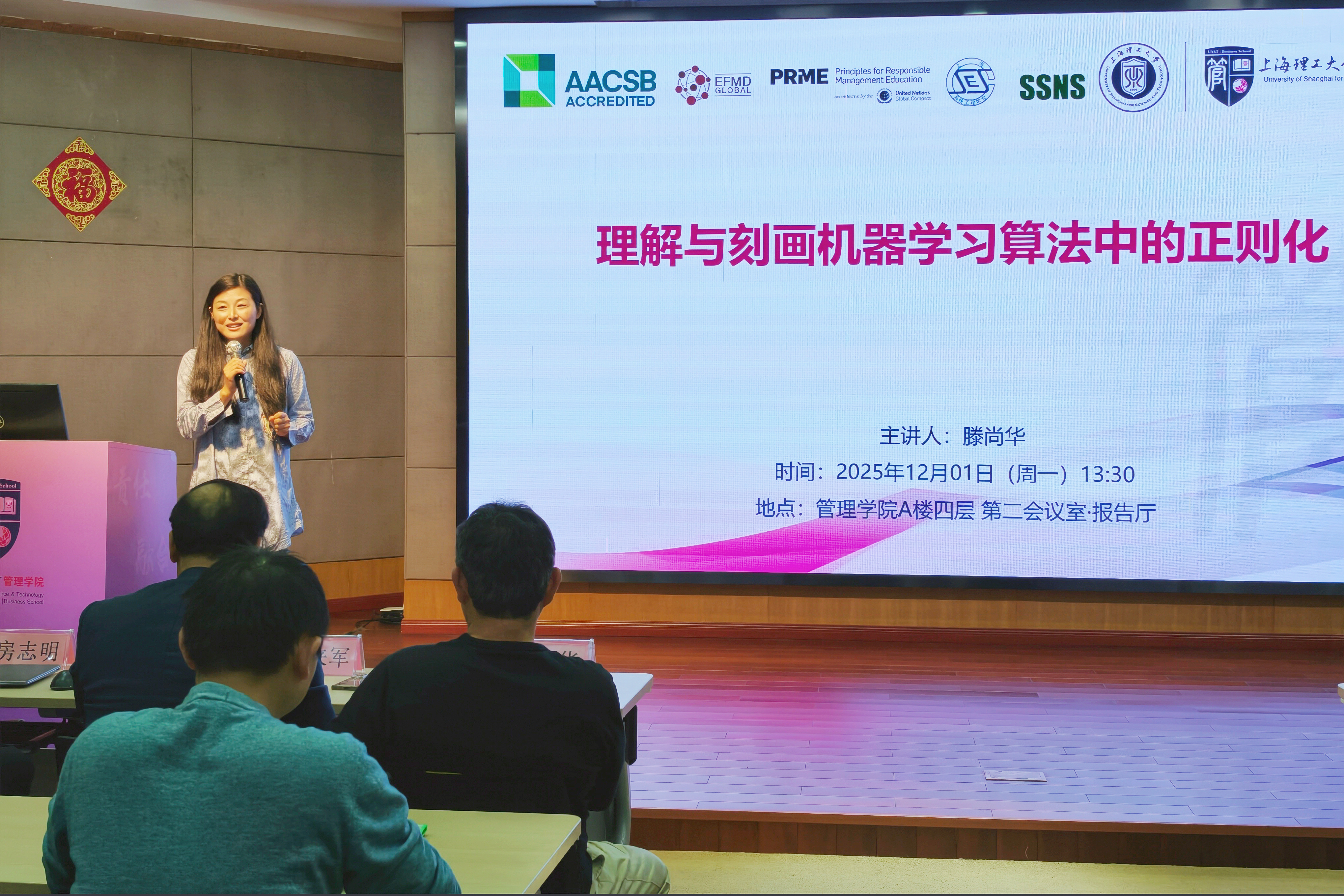 On December 1, the Department of Systems Science at the Business School hosted the 40th session of its Frontiers in Systems Science Lecture Series, featuring Professor Teng Shanghua from the University of Southern California (USC). A leading authority in theoretical computer science and two-time Gödel Prize laureate, Prof. Teng delivered a lecture titled Understanding and Characterizing Regularization in Machine Learning Algorithms. Attendees included Professor Zhao Laijun (Dean of the Business School), Professor Fang Zhiming (Vice Dean), Professor Gu Changgui (Director of the Systems Science Department), faculty members Gai Ling, Zheng Yu, and Lu Ke, as well as over 50 students and staff. The event was presided over by Dr. Gai Ling.